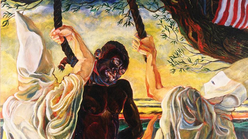 The first painting you see when you enter Arvie Smith's exhibition at the Portland Art Museum features a black man, stripped of his clothes, being lynched by hooded Klan members, with someone in the corner of the frame waving the American flag.