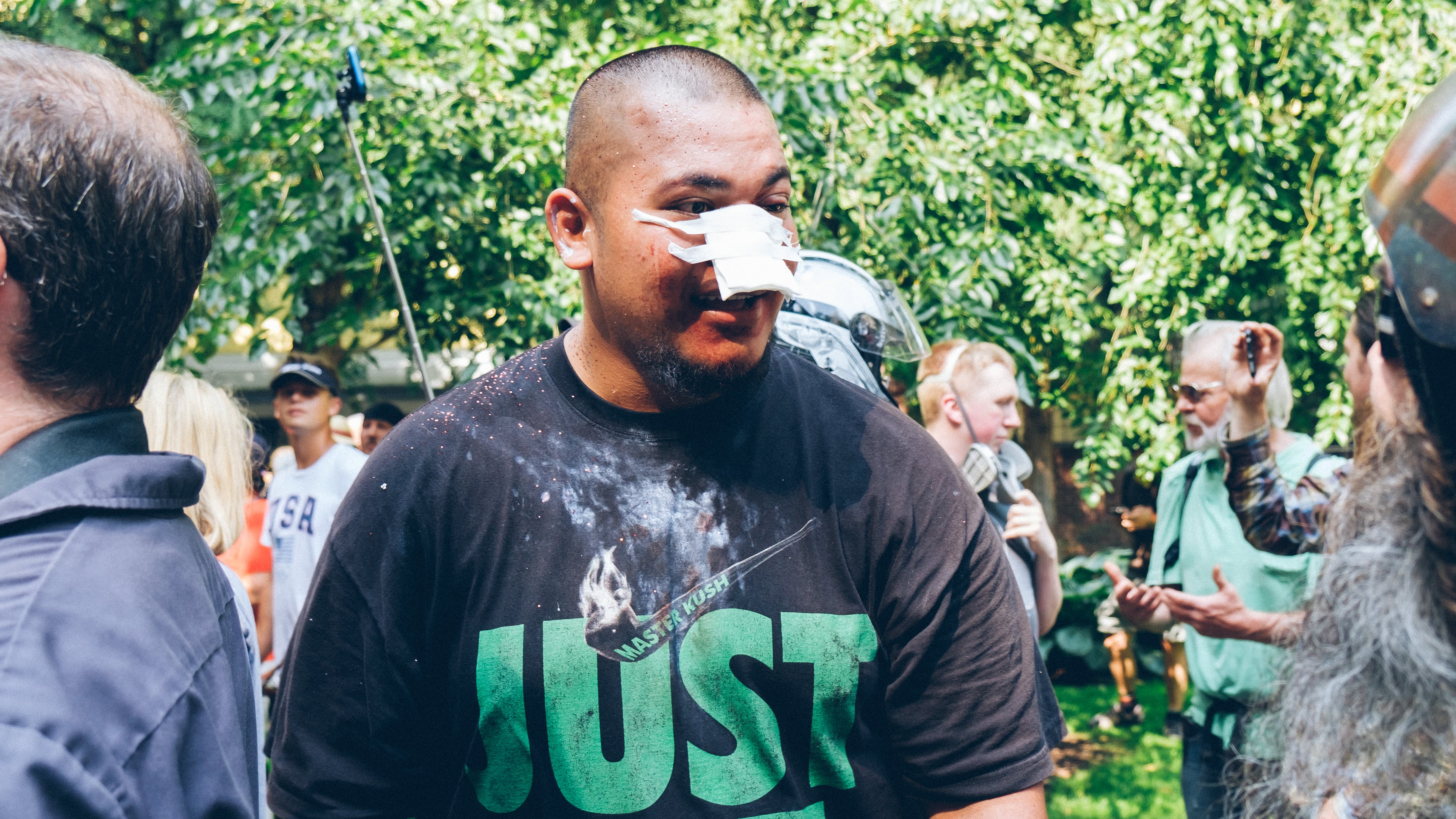Tusitala "Tiny" Toese, 21, perhaps the most recognizable person in the Portland area's far-right activist circles, was issued a criminal citation for disorderly conduct in the second degree. His nose was bloodied and bruised in a fight with counterprotesters. Despite his cuts, he continued to participate in the protest until it dissolved around 6 pm, when Portland police detained and cited him.