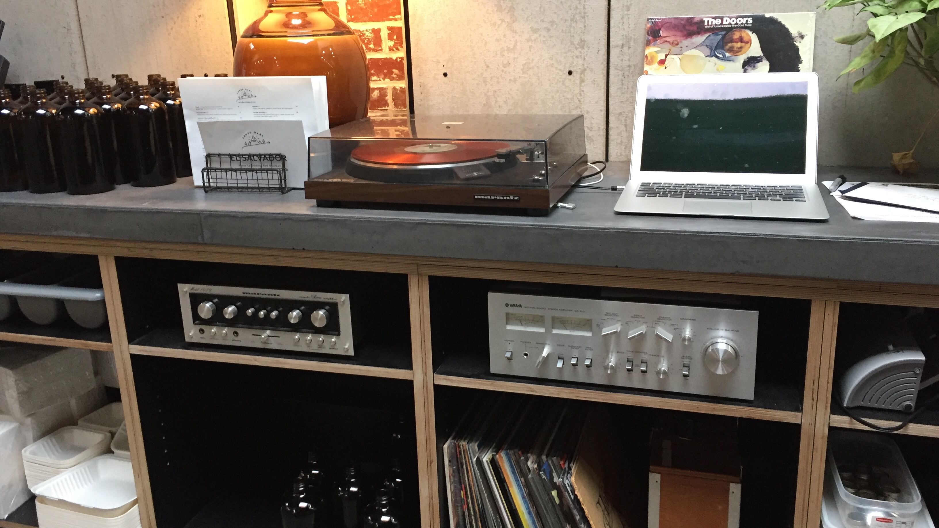 The system: A vintage Marantz amp, a Yamaha tuner, a vintage Marantz turntable and a MacBook all running over JBL speakers, which are meant to be paired and sitting on the floor but which here were hanging as single-monitor speakers in seemingly random places.