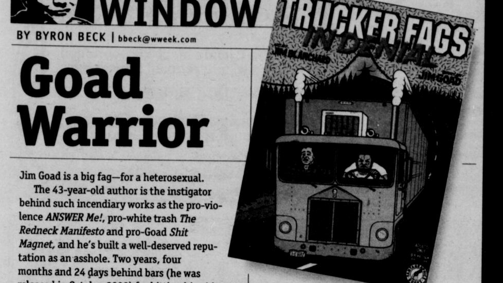 That said, I don't think Jim's a jerk. I think he leans more toward the savage-genius end of the scale in his latest tour-de-farce Trucker Fags in Denial. the graphic comic book, which first appeared in Exotic magazine, was written by Goad and illustrated by Jim Blanchard. The book puts the "graphic" in graphic novel, telling the story of Butch and Petey, two lonely, long-distance truckers who beat the shit out of "fags" and then screw each other silly. It's all Goad humor: twisted, vile, unrepentant…and absolutely hilarious. I met with Goad to talk about Trucker Fags, and here's what he had to say.