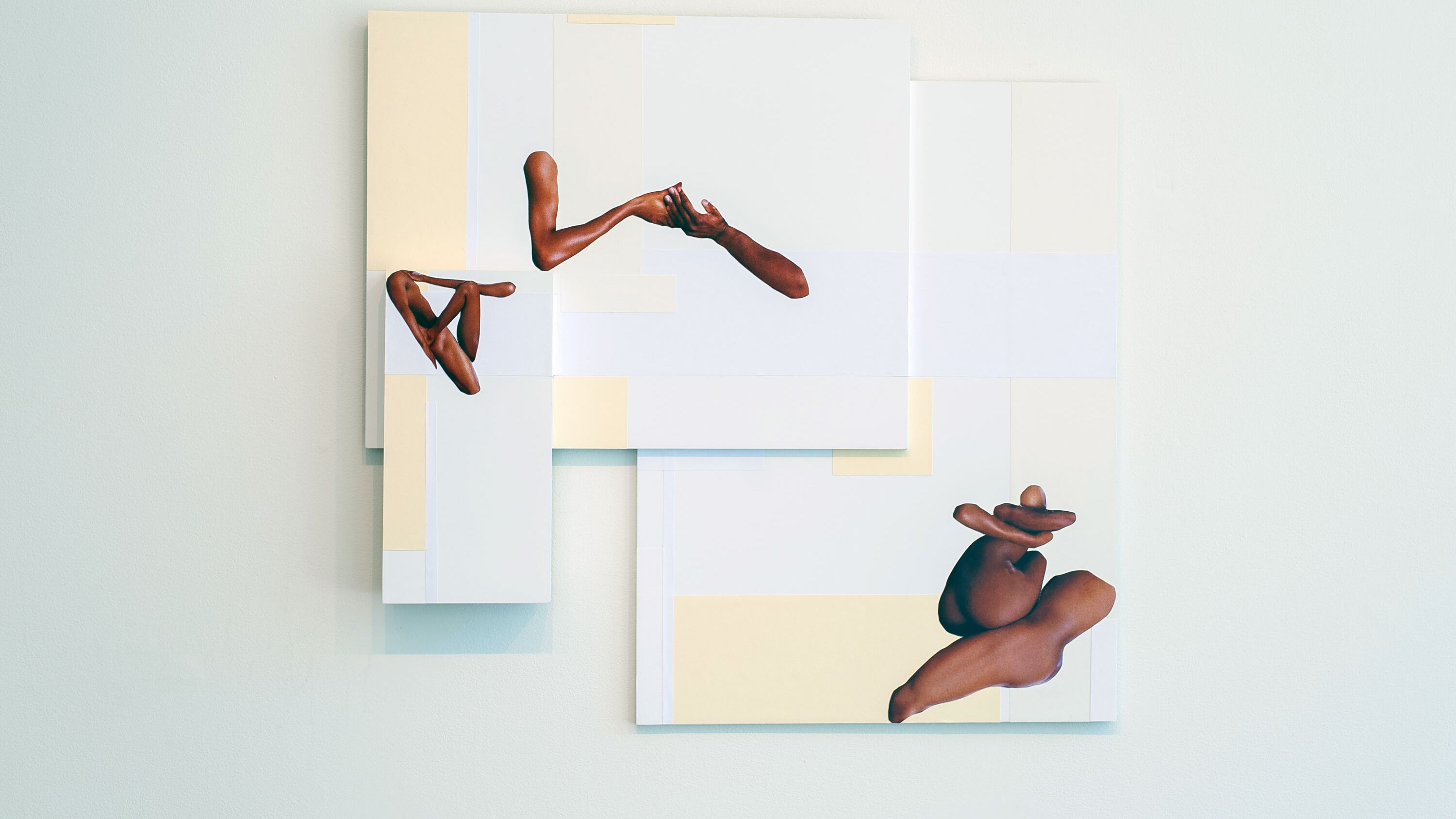 Johnston's series of collages are at first unassuming and almost surreal: They depict bodies that are headless, and sometimes just reduced to just legs and arms. But they begin to feel like they're giving off a kind of desperation. They're so close to being vibrant and intimate, but the bodies are fractured in a way that seems to intentionally deprive them of the humanity they'd otherwise achieve. On one of the canvases, two disembodied arms reach out to touch hands.