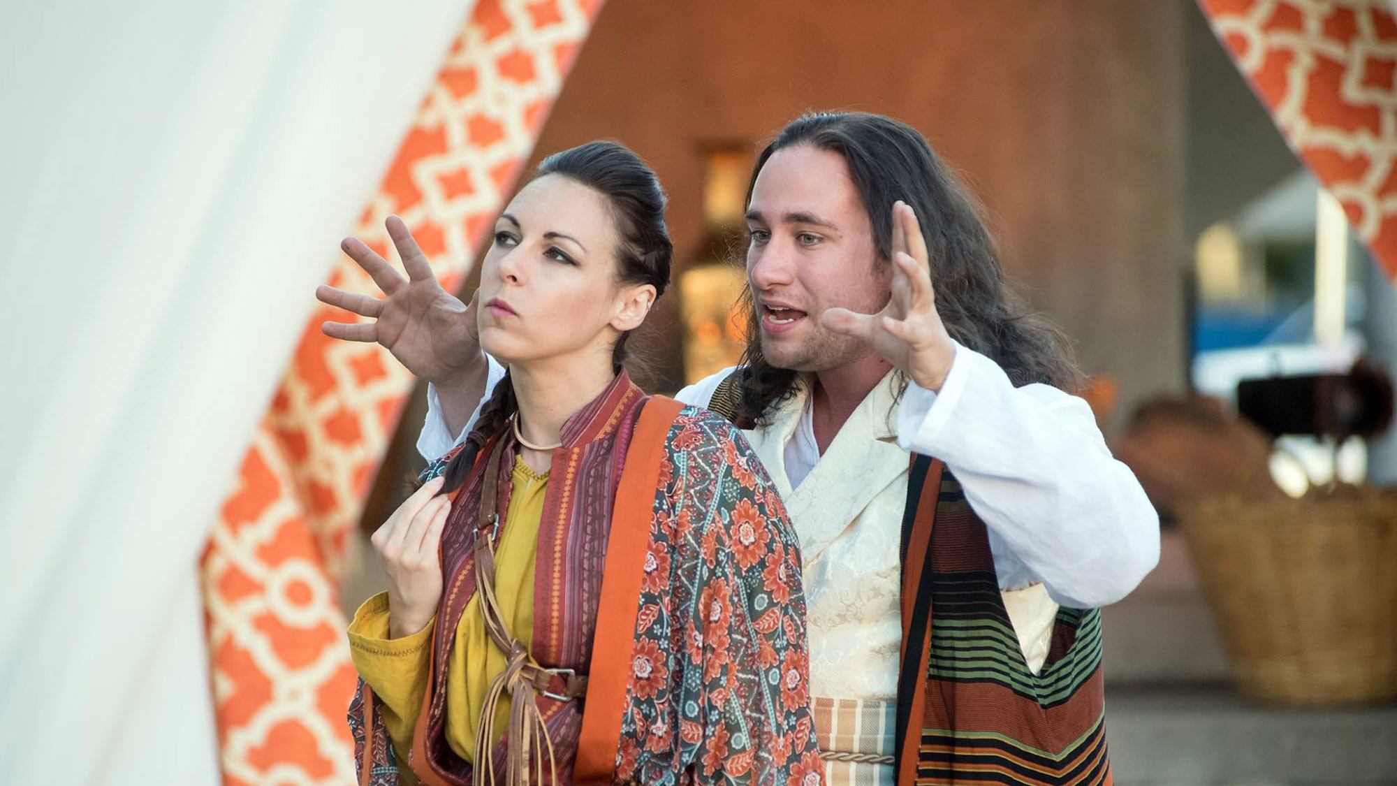 Artistic director Scott Palmer spliced together dialogue from both scripts, alternating between Elizabethan English and translated Persian. Capulets become Romans, Montagues become Persians. The opening scene sees the titular Majnun (Nicholas Granato) lay out a rug and pray to Allah. Later, he discovers spirits at a spring in the middle of the desert, and the occasional musical clip is steeped in Eastern chords and melodies. Soldiers fight with small knives and scimitars instead of European blades.