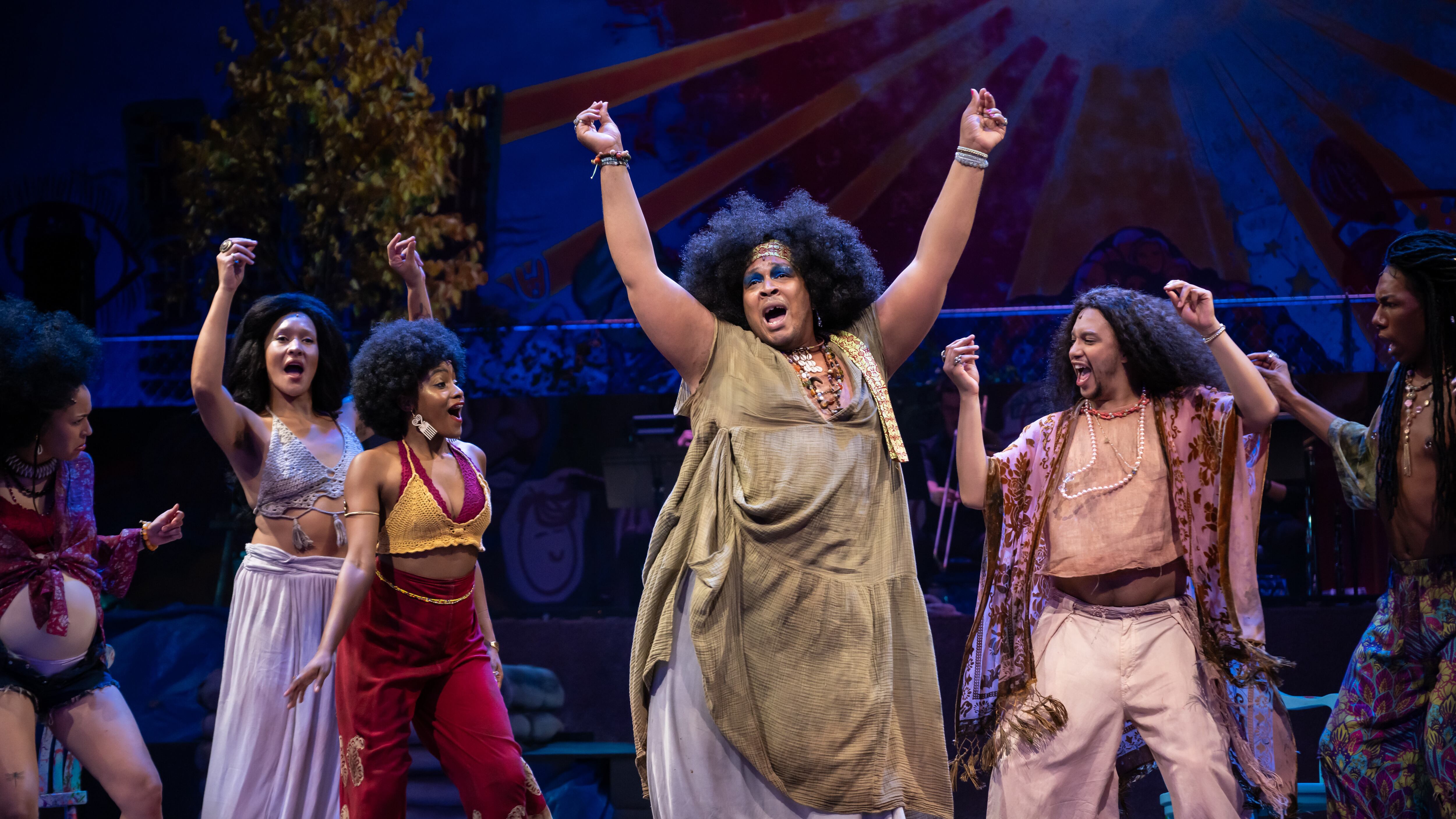 The play ends with another popular song, “Let the Sunshine In,” as red and yellow leaves flutter to the ground like bits of autumn sunlight. Like “Aquarius,” with which it was often performed as a medley, the song was a buoyant pop anthem in 1969, but here it’s a plea for peace that we’ve yet to find in 2023.