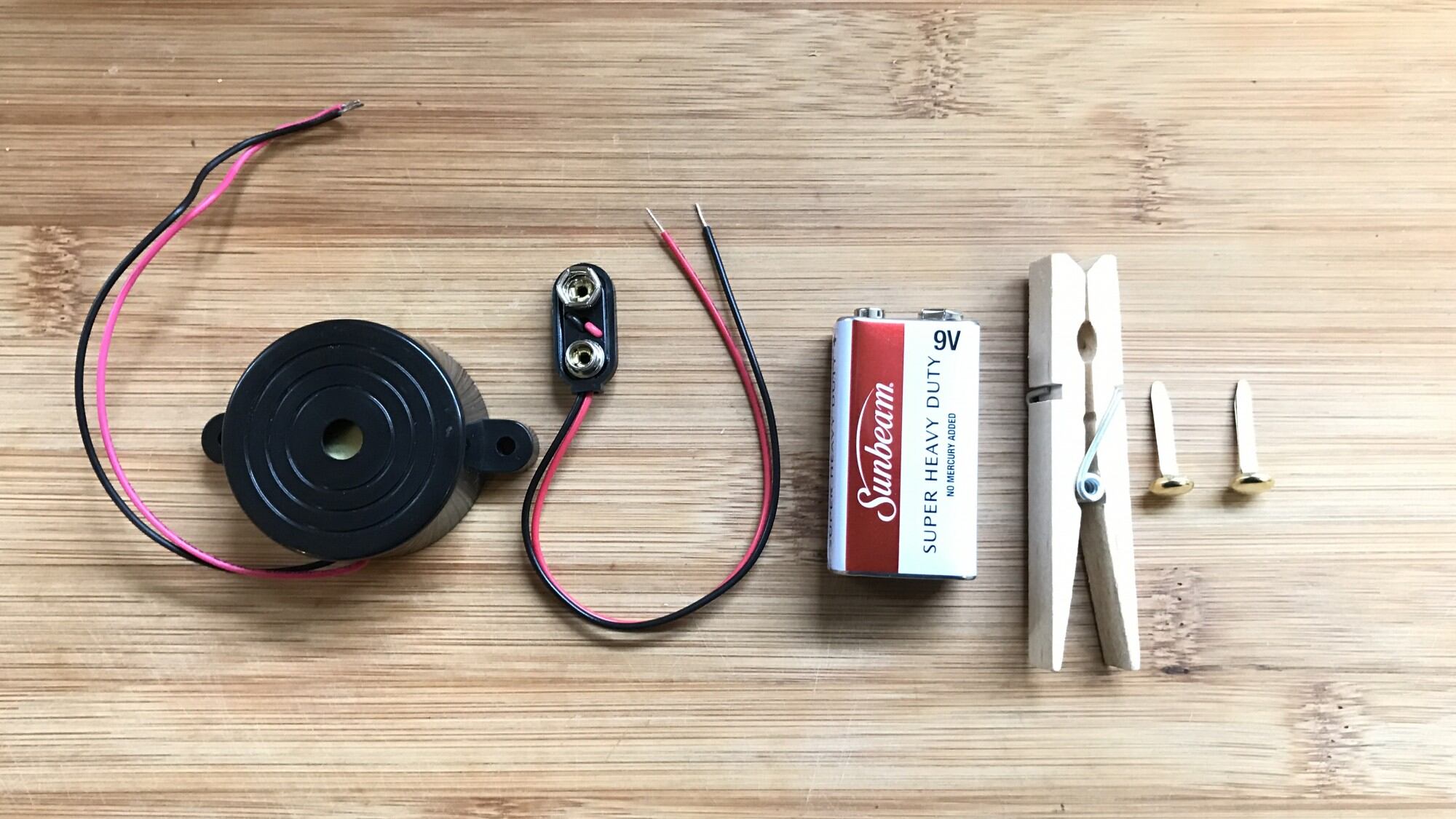For this tripwire alarm, we'll be powering a 108 decibel Piezo siren—the same sound element found inside a smoke detector—with a standard 9V battery. In order to activate the siren when our tripwire is disturbed, we'll use an on/off mechanism made out of a wooden clothespin and two brass fasteners. This clothespin will pinch down on a small piece of plastic attached to a string, and when tension is applied to the string, the piece of plastic will slide from the clothespin's grip, the circuit will activate, and the siren will make loud noises.