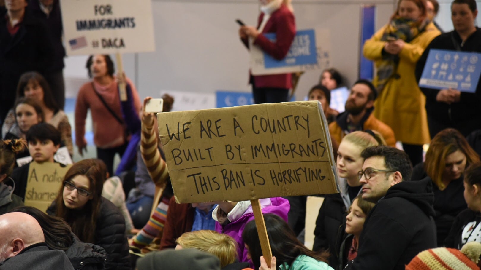 As many as 1,000 protesters met to protest Trump's executive order that halted immigration from seven Muslim-majority countries. The protest lacked official organizers, and the group moved freely about most of the airport, often coming back together outside the departures check-in counters.