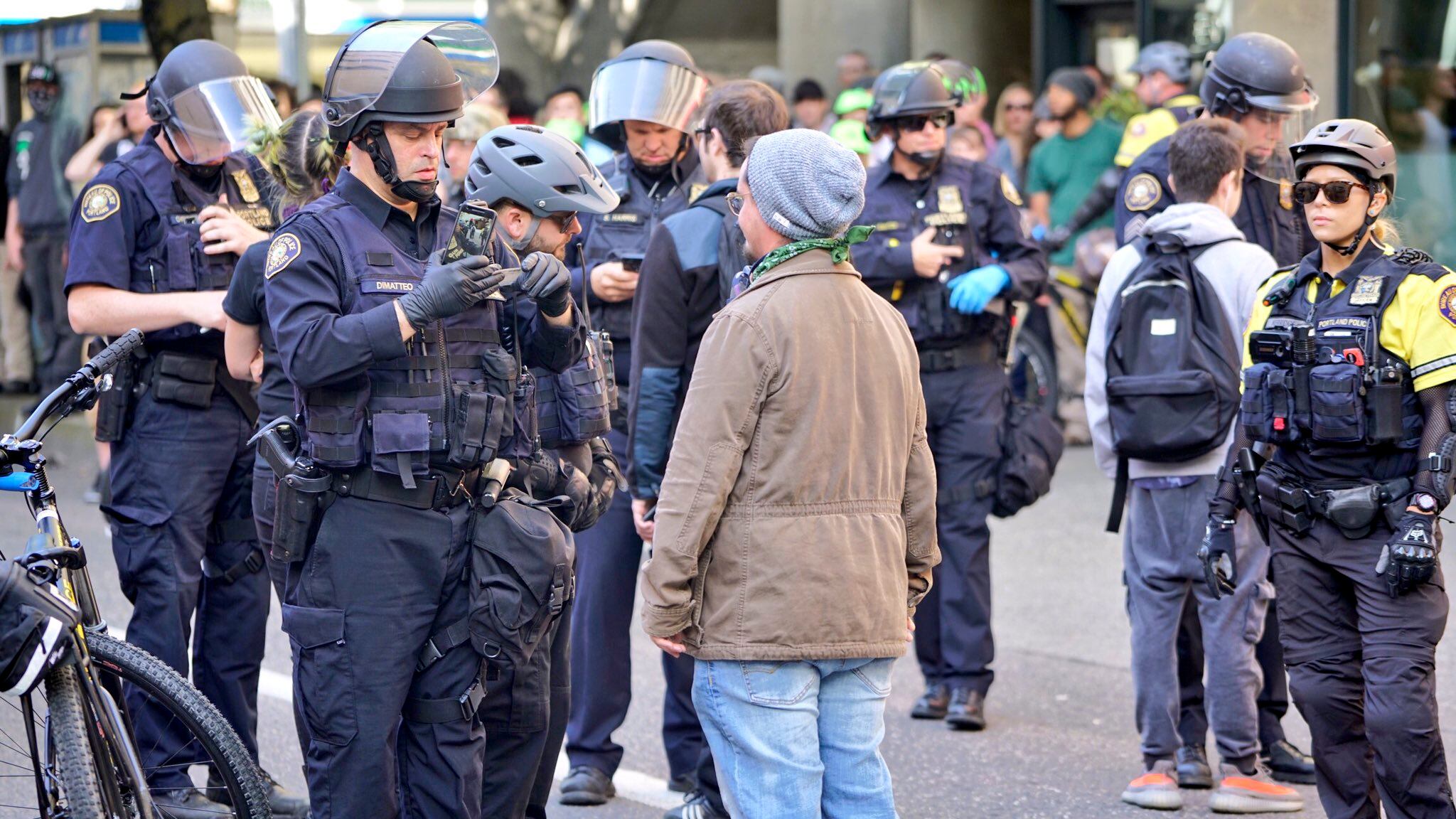 A few blocks north, in the streets outside Pioneer Place, police surrounded a group of at least 345 people and detained them en masse, a technique called "kettling." The police forced each person caught in the kettle to submit to a photograph and show personal identification, which officers recorded before releasing the protesters one by one.