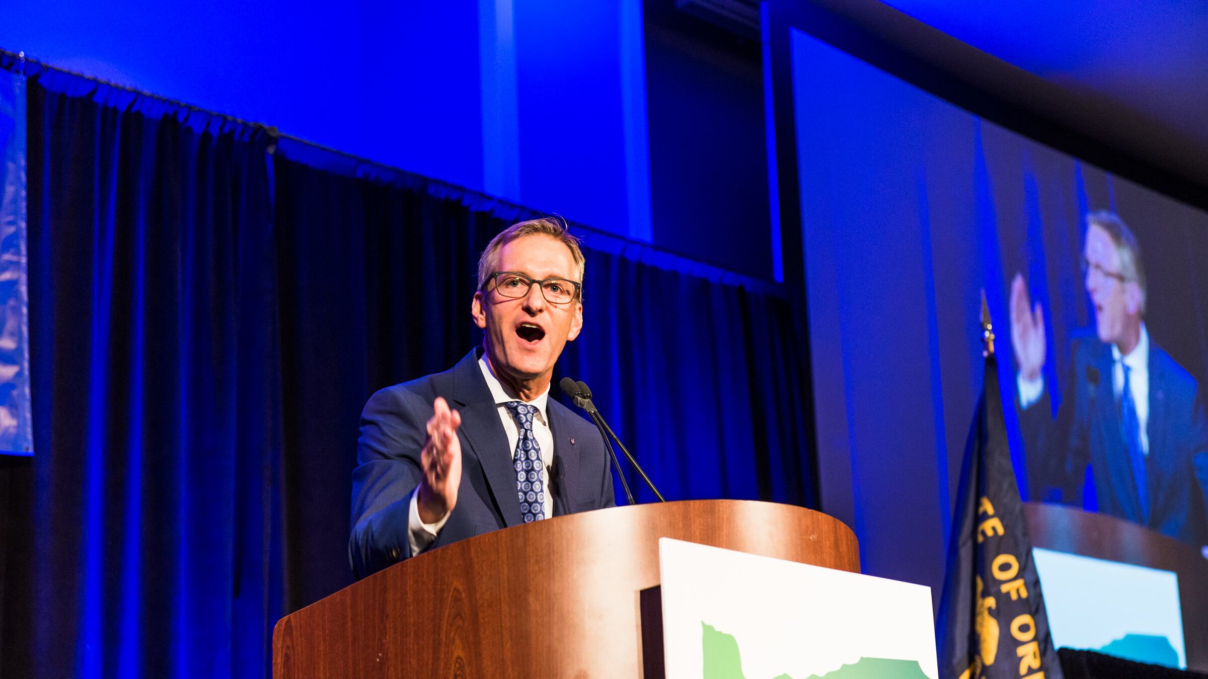 Ted Wheeler mutters, “I cannot wait for 24 months to be up,” as he leaves Oregon Health Forum after speech (interrupted by shouting) and Q&A about homelessness.