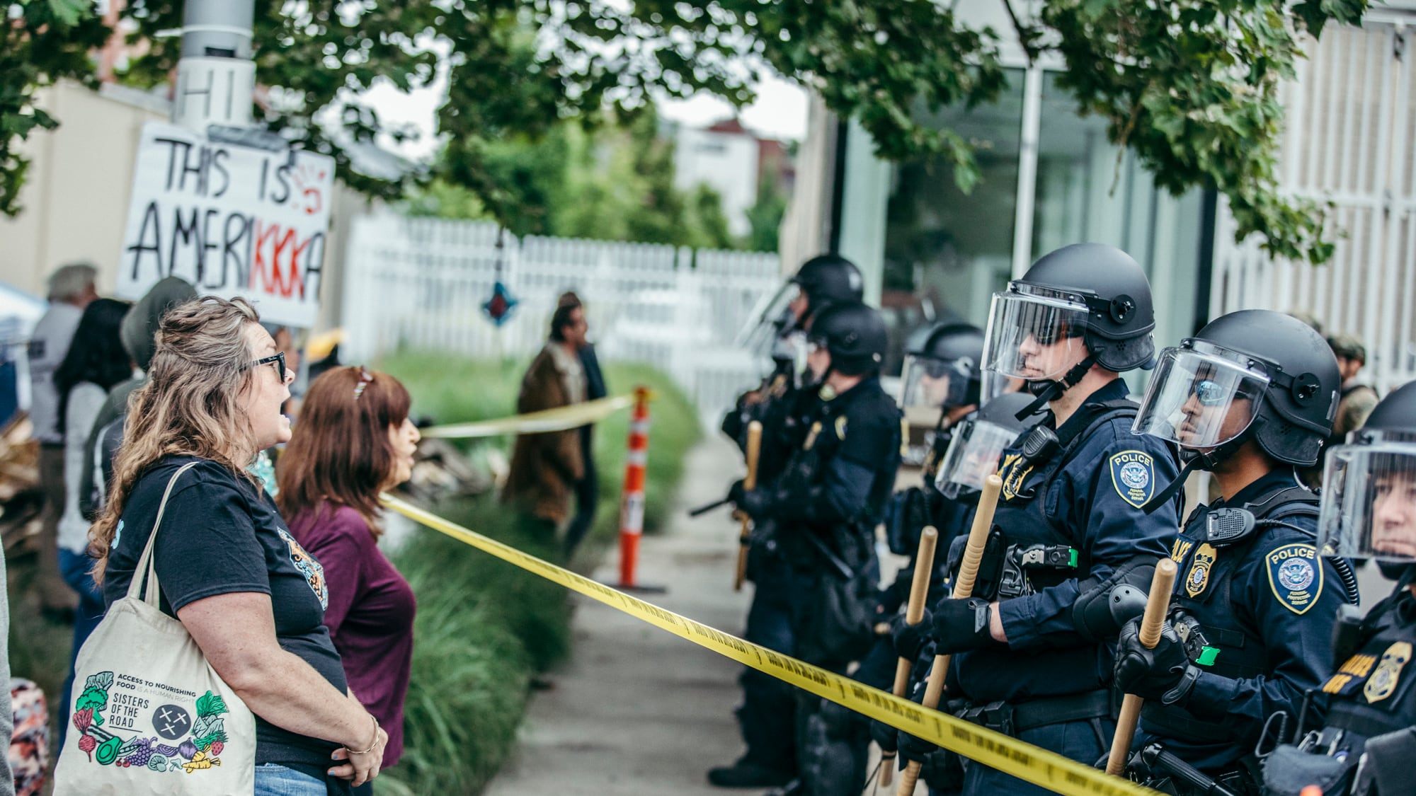 3. The Protest Stage: Protesters, many of whom were mothers, children and college students on a quiet Saturday afternoon, line a grassy area just in front of the police line. They have been urged not to talk to the DHS officers standing nearby.