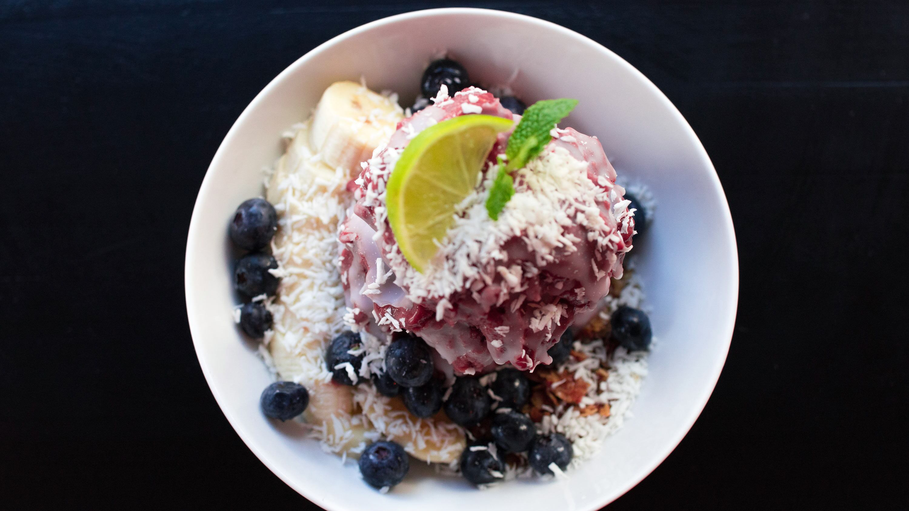 Which is ludicrous, as acai bowls are healthy ice-cream sundaes. Just replace the ice cream with a sorbet that tastes like a lightly sweet mix of grape juice, blueberries and strawberries, trade the cookies and whatnot for fresh fruit and granola, and replace the sauces with a big pile of almond butter, honey and nuts. That's an acai bowl—it's delicious and cheap, and you can eat one for a meal and not feel sick.