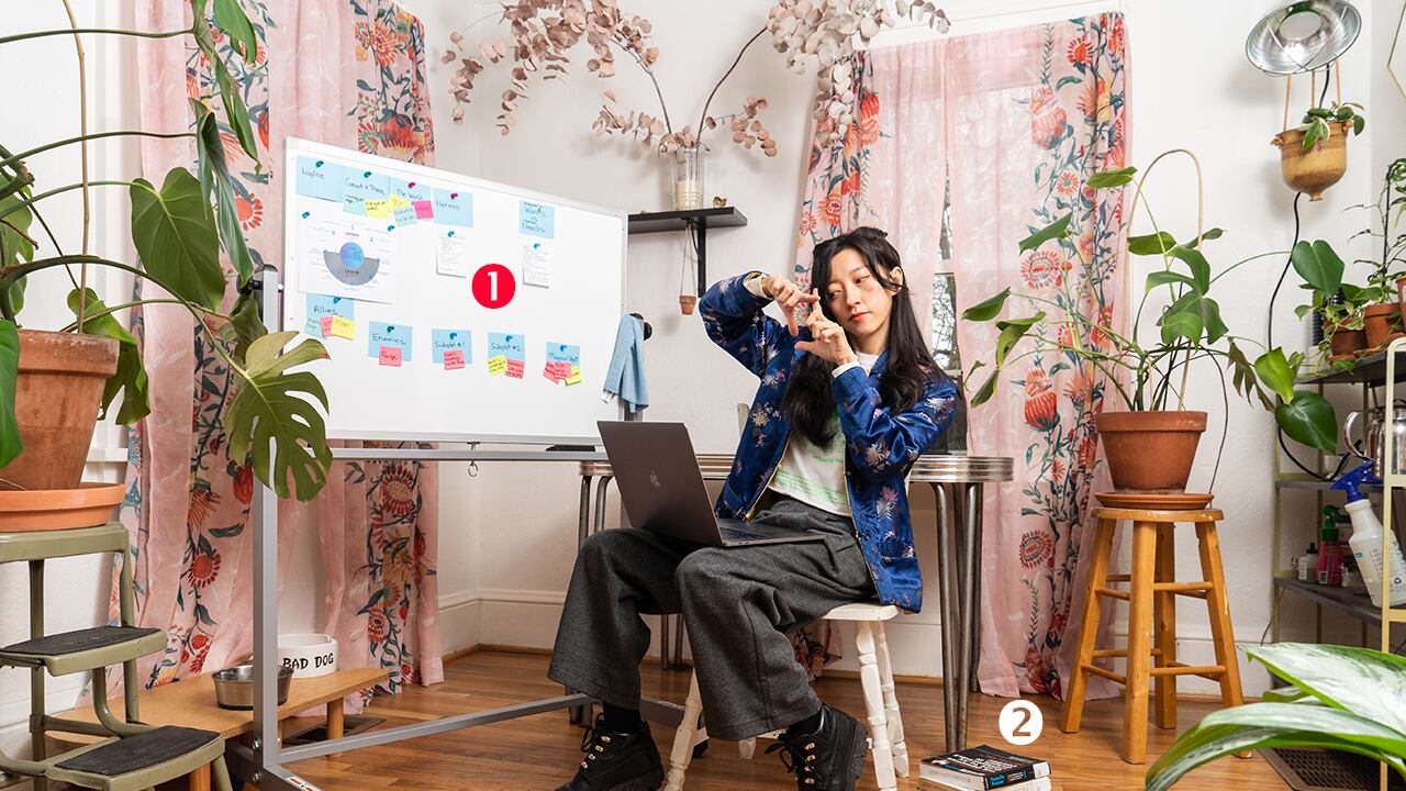 Though Poon does most of her work digitally, she has a massive whiteboard she wheels with her from room to room. "It's important to have a physical, tangible thing you can touch to step out of the digital world," she says. "It makes it seem like less work. When you're sitting at a computer you're like, 'This is work.'" Right now, her whiteboard is covered in notecards for a pilot she's working on, with cards for a log line, concept and theme, the setting, heroes, and "wants vs. needs." "This is very typical narrative storytelling elements that you need to tell a good story," she says.