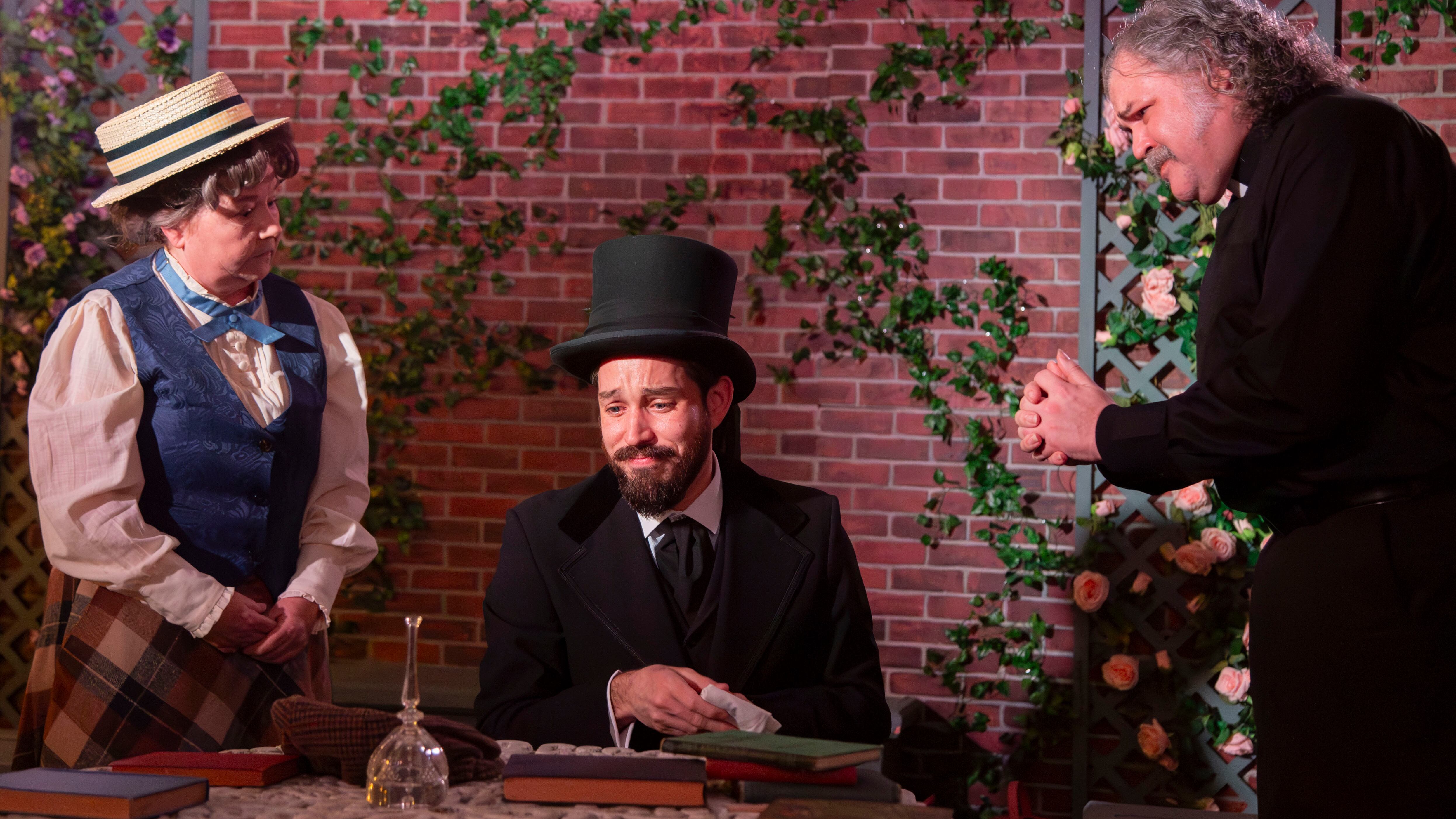 Once the train “arrives” in the country, the audience steps into Jack’s garden, where invisible birds are singing and the pink roses growing on the trellis mirror the floral print on Cecily’s gown. Sitting on chairs and benches arranged near a set of ornate white patio furniture, the audience is close enough to the actors to admire the details of the splendid costumes (designed by DeMara Cabrera), including the creamy shimmer of a hat perched on Gwendolen’s brunet coiffure.