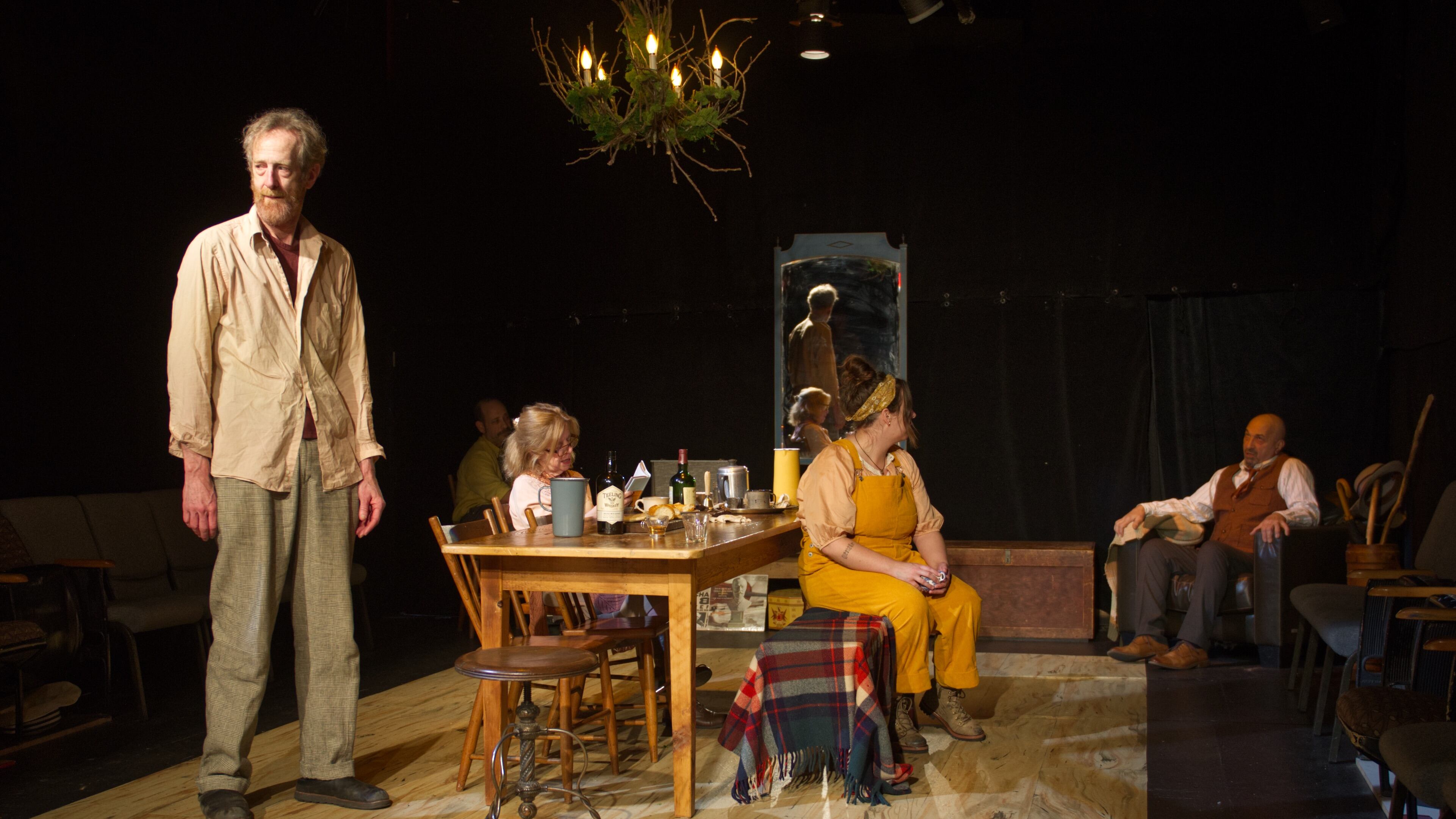 As relatable as these feelings are, 21ten’s adaptation of Štěpán Šimek’s translation narrows the distance even more between modern audiences and the 100-year-old Russian play by folding in contemporary touches. Among the props are the ailing professor’s plastic pill bottles as well as a turntable and records. In this context, we’re not surprised to hear Astrov sing Tom Waits’ “I Hope That I Don’t Fall in Love With You’' or see the hardworking Sonya wearing Carhartt-style overalls. The language, too, has a contemporary flavor. Astrov refers to himself as a “treehugger,” and Vanya’s barrage of f-bombs are commonplace to 21st century ears.
