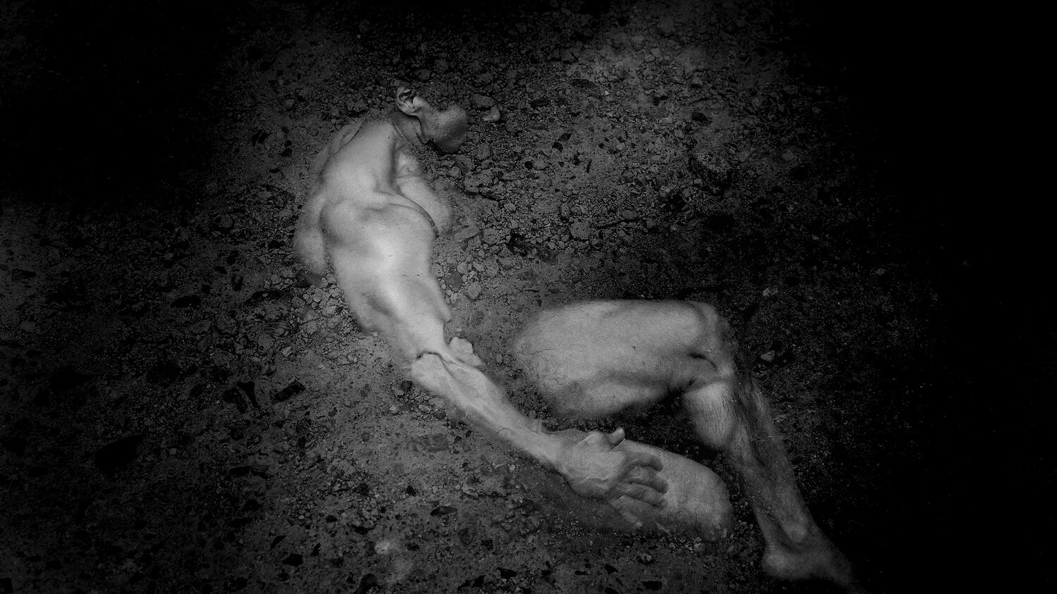 Wozu’s human bodies are in conflict with bodies of water. Most of the show resembles a fever dream about nude bygone bodybuilders like Mickey Hargitay waging a cinematic battle against a shredded da Vinci Jesus and his swole disciples. You’re welcome to insert your own touchpoints, since faces are never shown. Water is rarely depicted outright, but represents the distortions in melting physiques. Water appears most aqueous in Wozu 19, as a large spherical droplet reflecting, or containing, most of two men. Wozu 20 shows two men with sculpted backs and buttocks approaching a third man on all fours, but the way Lee positions his subjects makes the shot feel less like a Tom of Finland fantasy and more like a John Carpenter one.