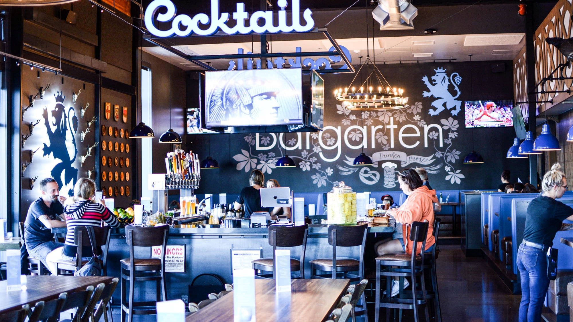 Sleek round chandeliers and banners branded by Bitburger and Paulaner dangle from a soaring wooden ceiling. One wall looks like it could've been ripped from a German grandmother's house, with its old-timey Black Forest cuckoo clock surrounded by decorative plates. A herd of what appear to be jackalope skulls are mounted next to a roaring lion reared up on its hind legs, a hop cone acting as the tuft at the end of its tail.