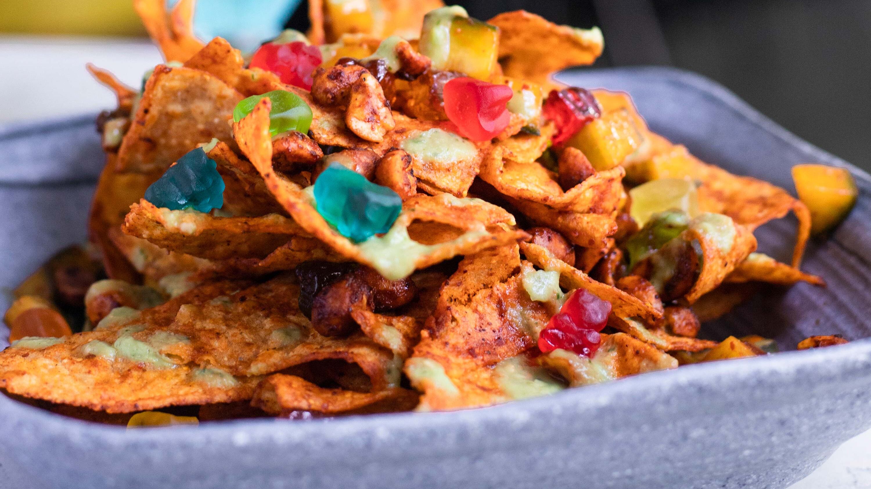"Dorilocos" sounds like a Taco Bell menu item, and isn't that far off: It's a pile of thick housemade corn chips, peanuts, tomatillo-avocado salsa and, indeed, a smattering of squishy little grizzlies, which make for a delightfully chewy surprise each time you bite into one. If street vendors in Mexico City hadn't thought of it first, surely a stoned kid let loose in a gas station at 2 am would have.