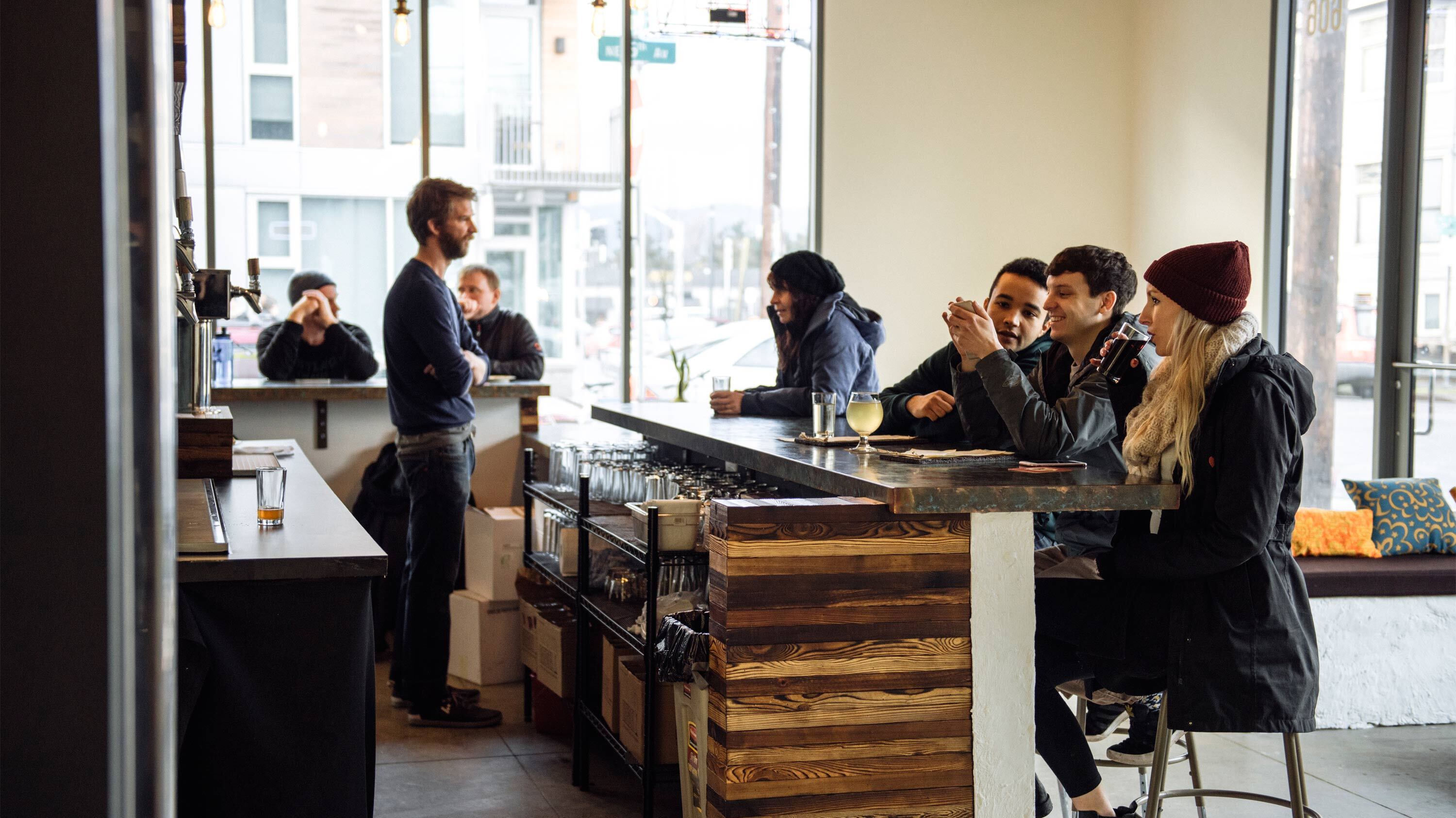 Owners Alan Hill and Benjamin Allen built their refillable-bottle bar pretty much from scratch with a lot of recycled materials. In a nook with bench seating, the coffee tables are made of gnarled, knotty wood that would have been otherwise unusable, stained and oiled to a pretty shine. Alongside a sake tap and taps of by-the-glass wines, the tap list includes a fantastically complex Belgian strong pale from cult brewery Mikkeller, alongside local standbys like Pfriem IPA and Commons Farmhouse for $5 a glass or $6 a pint.