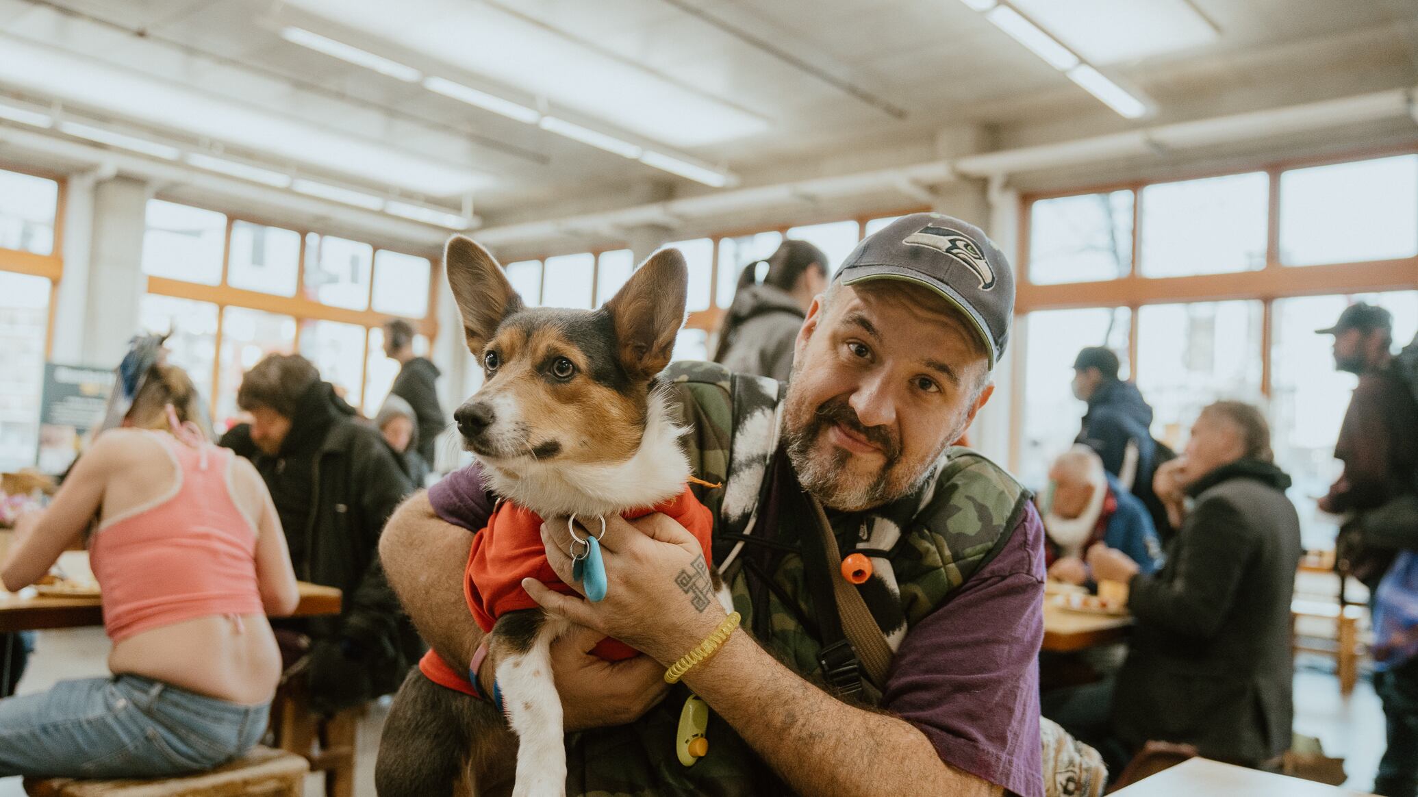 In addition to its people-oriented services, Blanchet House also has resources for companion pets and service animals. After all, as many as 1 in 4 homeless individuals in Portland are pet owners, according to a stat Portland Animal Welfare Team executive director Cindy Scheel shared with OPB in 2017. The cafe offers pre-portioned kibble bags and water bowls for the pups, as well as a free supply closet stocked with collars, harnesses, treats and cans of wet food, among other things. “Sometimes it can be hard to get them food,” says diner Sean, looking down at his rambunctious 5-month-old black and white Boston terrier, Cash, who alternated between ferociously attacking his kibble and messily slurping up water. “But this is a great place,” Sean adds.