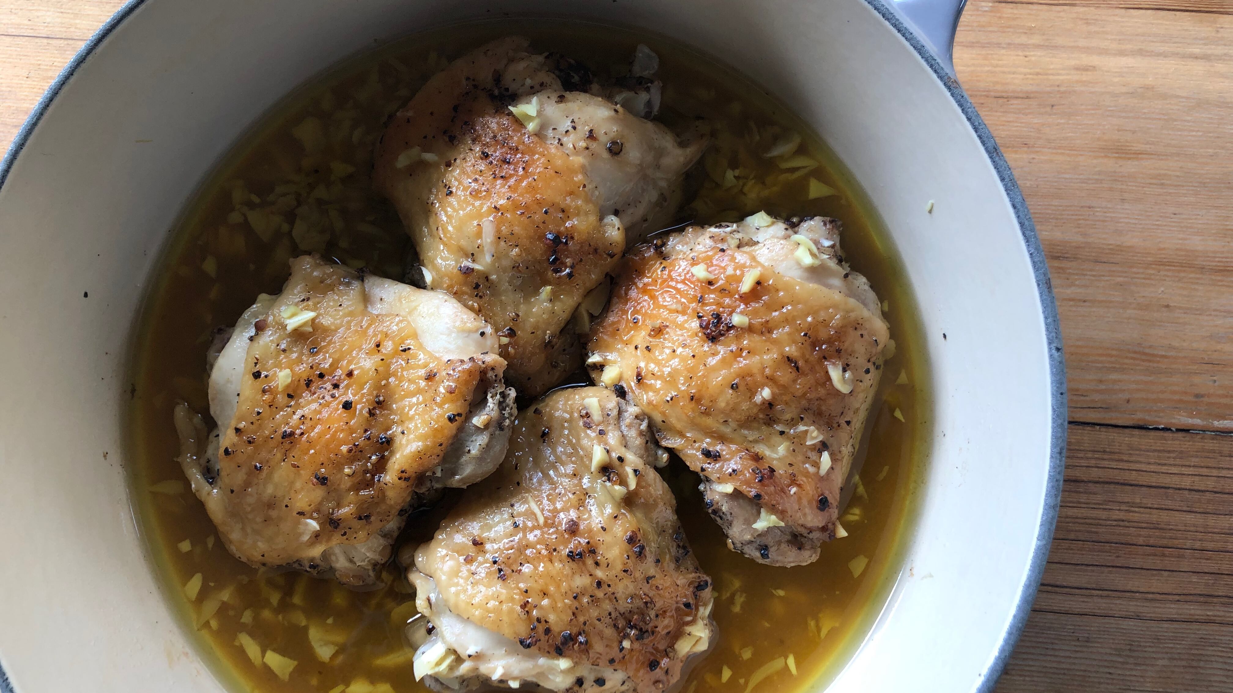 Sprinkle the chopped garlic over the chicken, add the vinegar, reduce heat to low, and cover the skillet. Cook for another 10-20 minutes, or until the thighs are cooked through. Serve with rice, bread, potatoes, or something similar to soak up the juices.