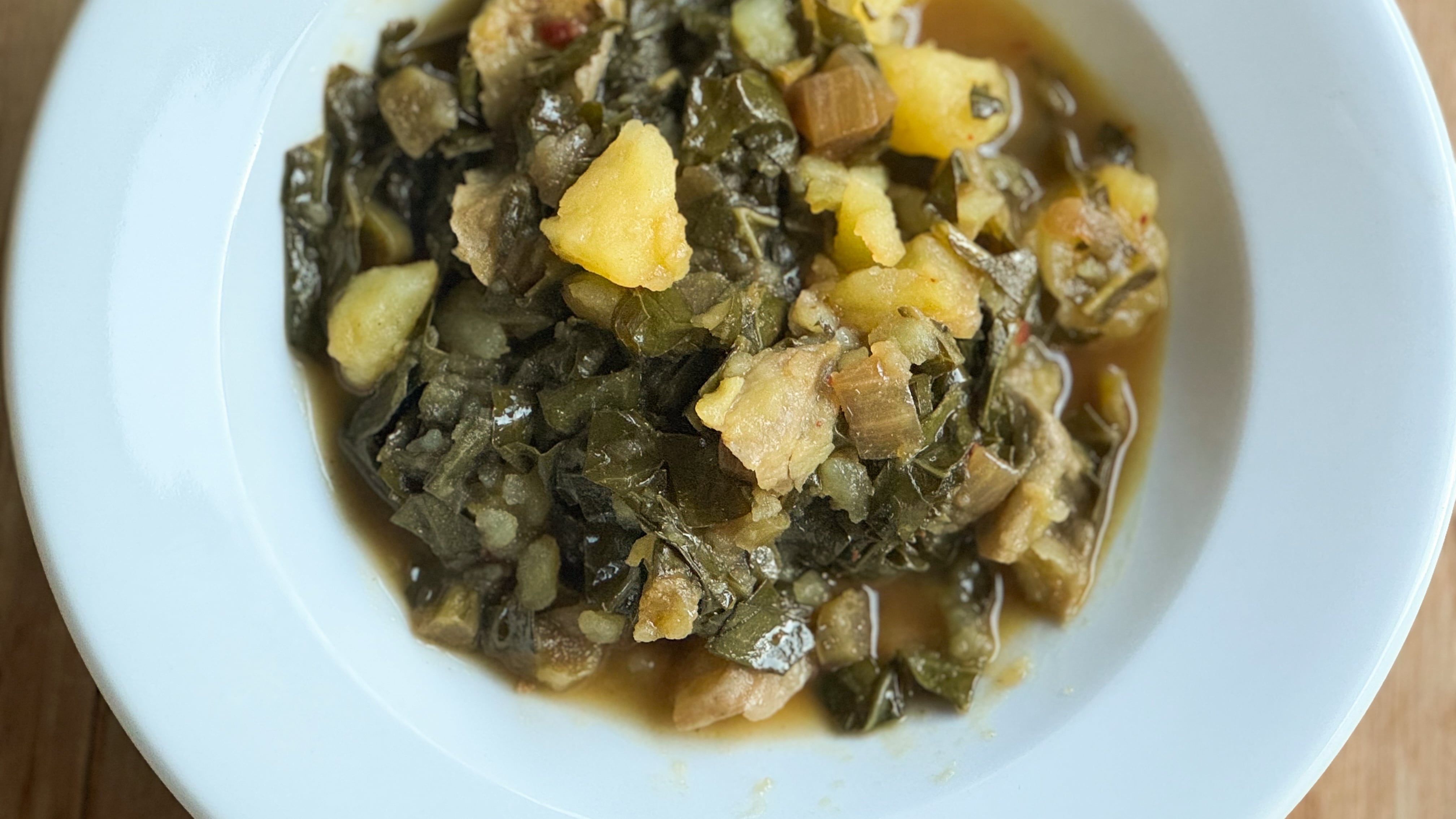 Add the potatoes and cook for another 30 minutes or so, and then stick a fork in the spuds to make sure they’re done and about to fall apart. Use a slotted spoon to transfer them to a plate, and then crush them into bite-size chunks. Stir them back into the greens, add the soy sauce and vinegar, and cook for another few minutes. Serve hot with cornbread or something bready to soak up the pot likker.