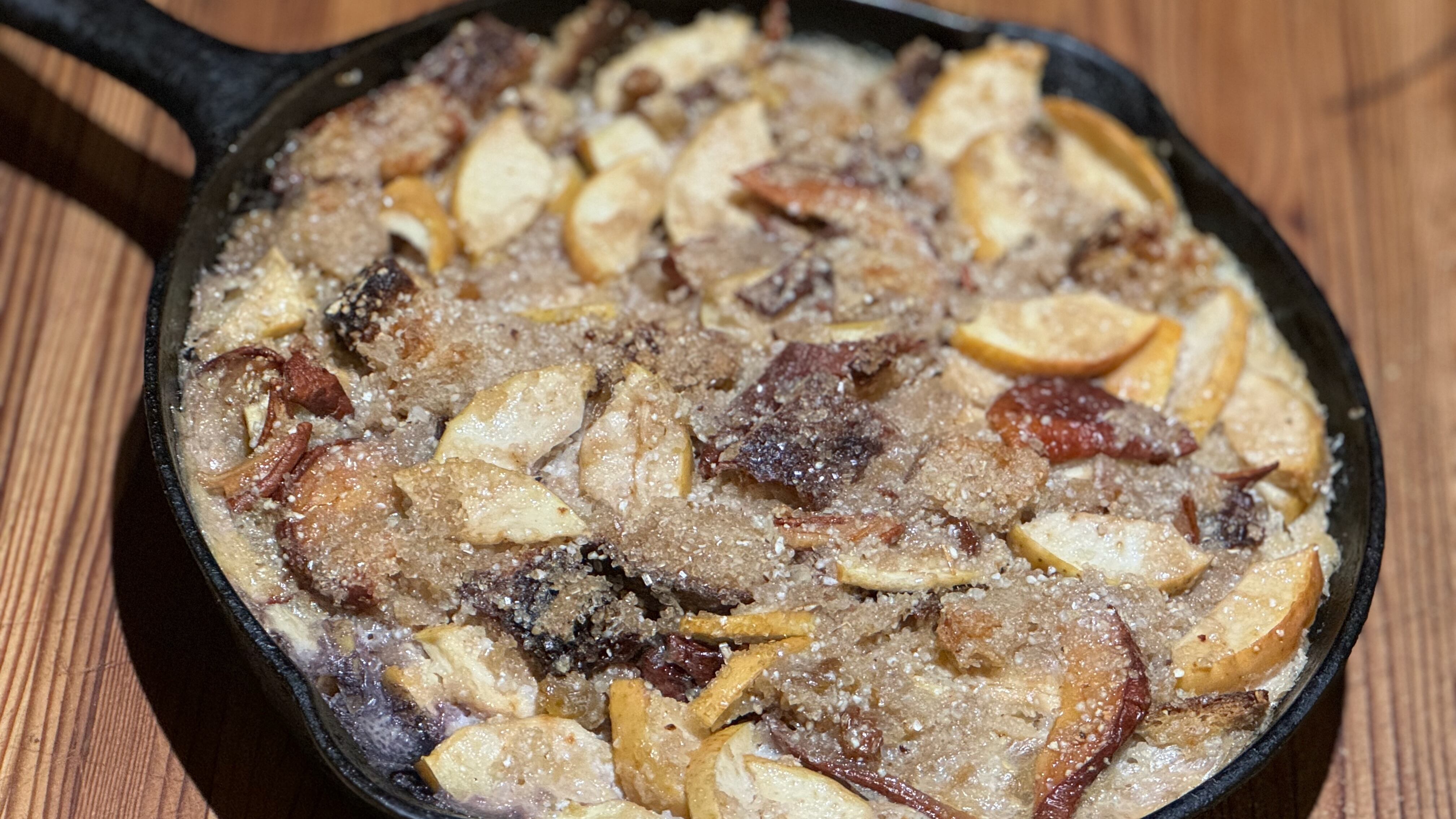 Grease an 8-inch skillet or similarly sized baking dish with a little olive oil or butter. Add the bread mixture and press into the pan. Sprinkle a little more sugar on the top. Bake at 350 degrees for an hour. You can eat it warm, and it’s pretty good, but I think it’s even better the next day. And better yet with a splash of cream.