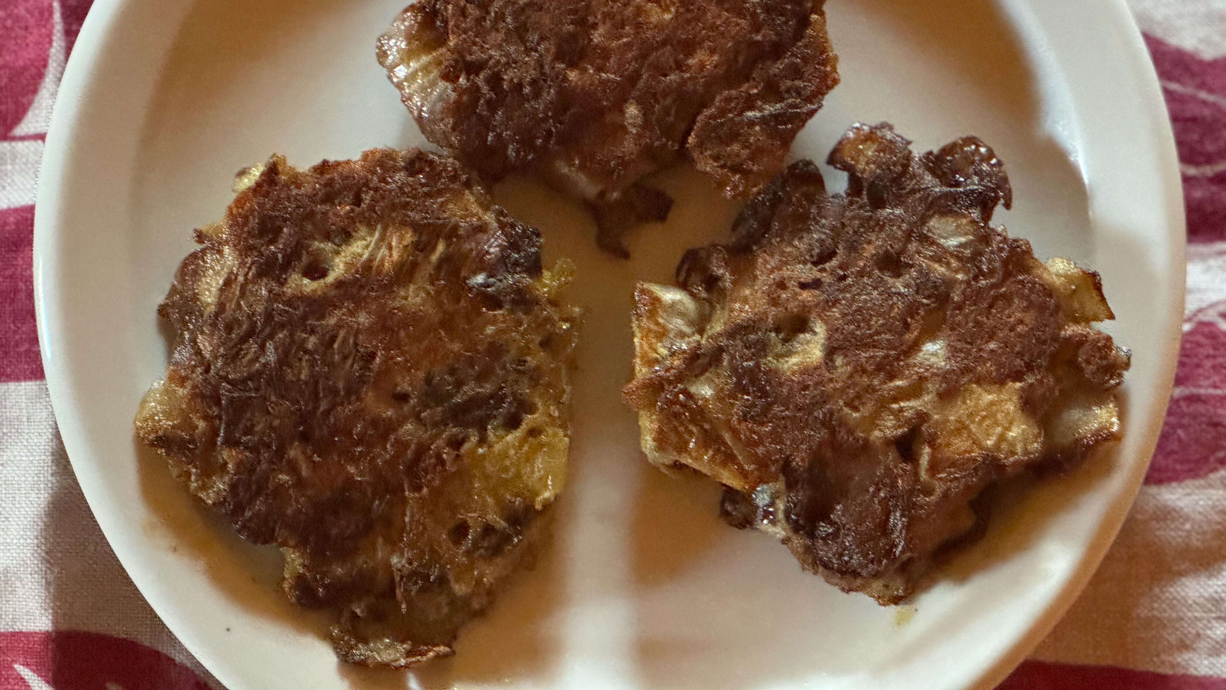 Radicchio varieties beyond Chioggia lie at the farmers market and a few of Portland’s better produce sections. Any of them will work in these fritters, but I usually get a pointy head of Treviso. Since the various types can differ in size, the recipe quantities are mostly suggestions. If the mixture seems dry, add an egg; if wet, more breadcrumbs. And fry a single test fritter first to see if it holds together as the egg cooks.