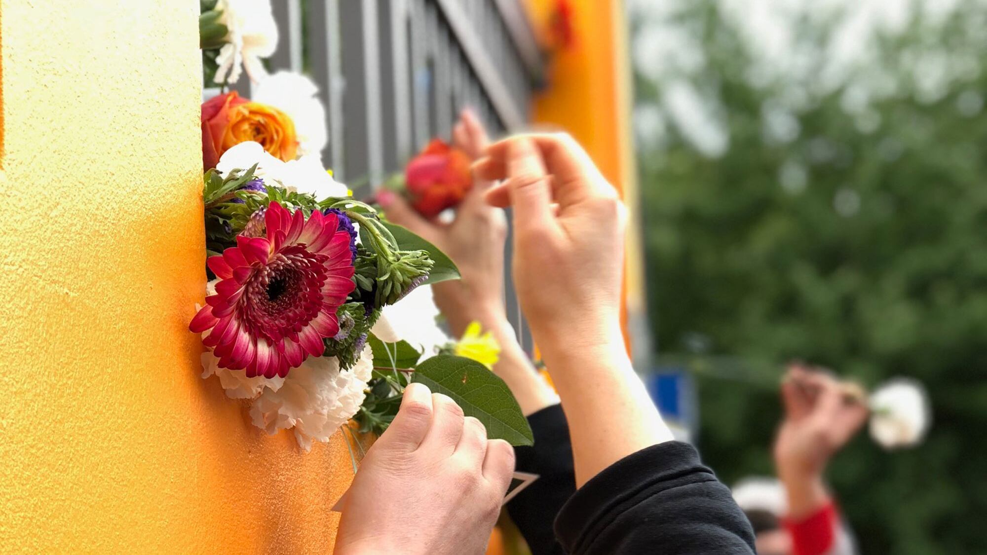 A procession filed toward the mural to begin leaving flowers. Some had brought their own flowers, and some spoke to the family members who gathered near the base of the mural.