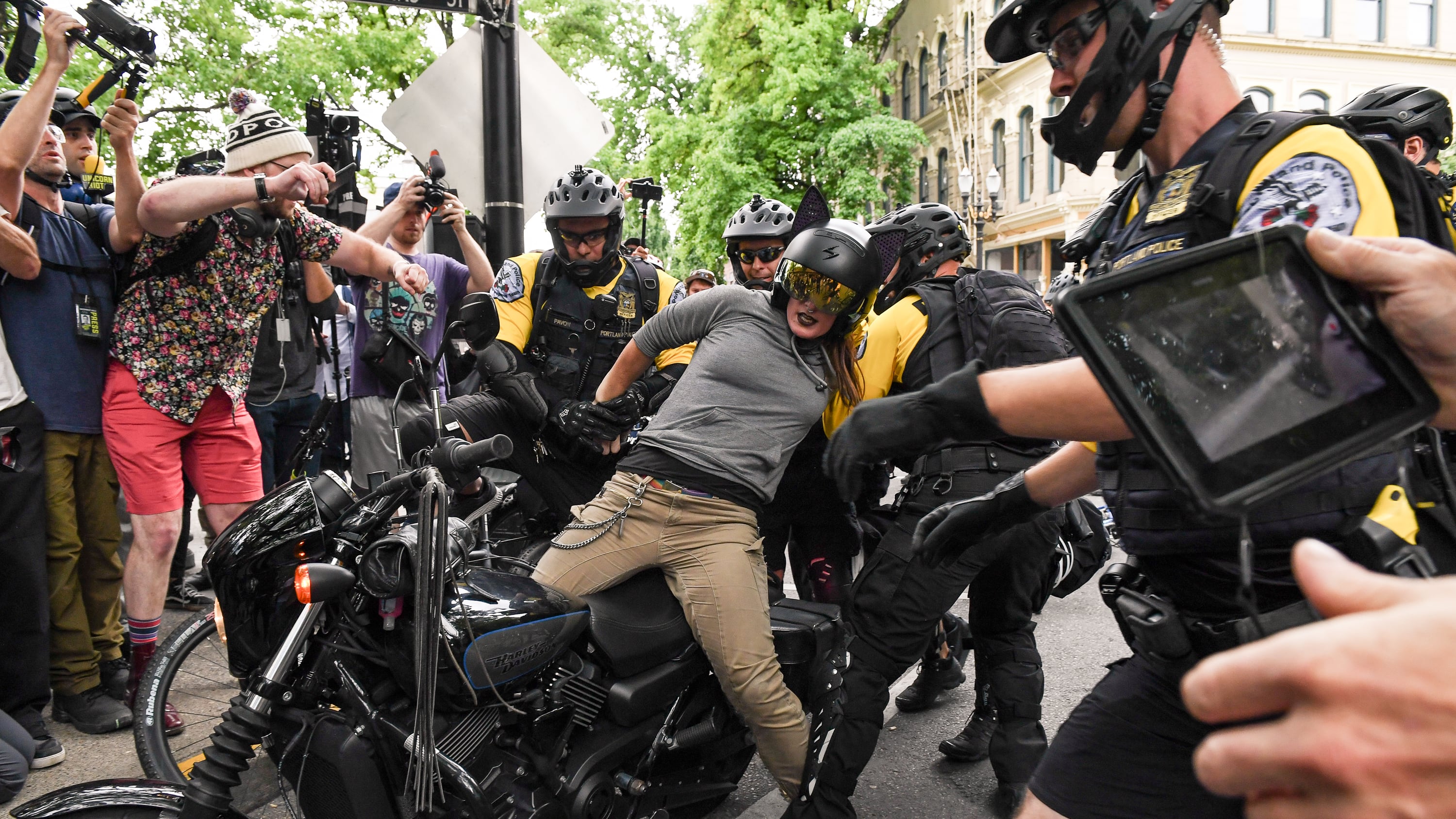 Later, police clashed with frustrated leftists, arresting several and tackling at least one woman to the ground, drawing an angry crowd for a tense standoff near the Portland Outdoor Store.