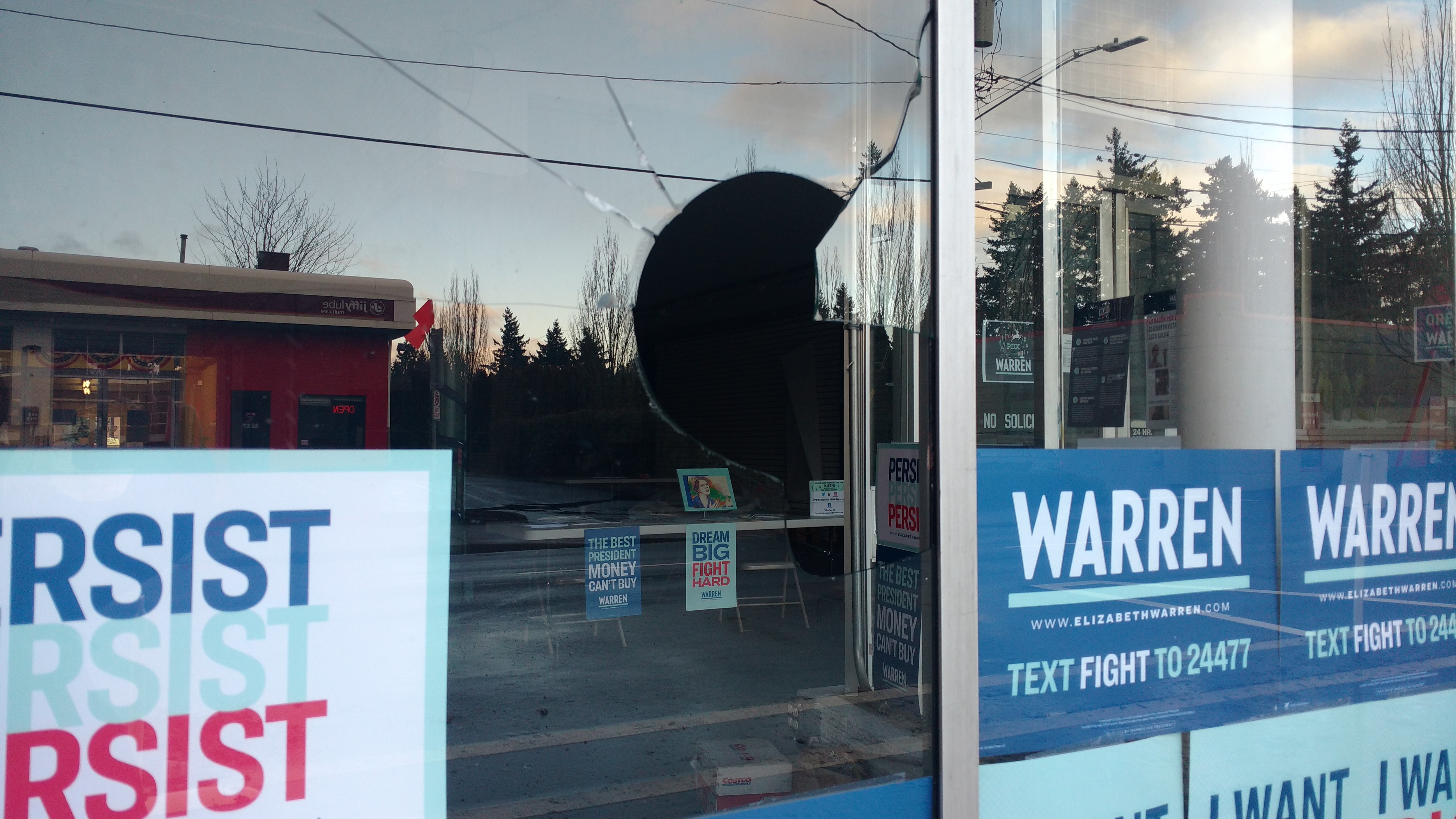 On Jan. 12, U.S. Sen. Elizabeth Warren (D-Mass.) opened a campaign office in Northeast Portland. By this morning, its front window had been smashed in.