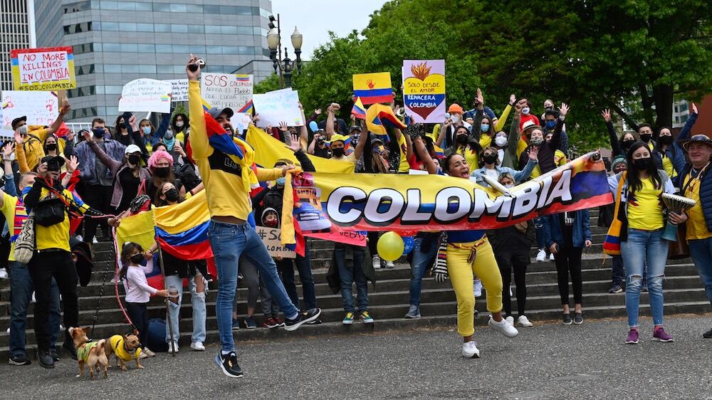 The daytime demonstration was advertised as a peaceful rally—a contrast with Portland’s own unrest, in which masked marchers sporadically break windows and sometimes set fires to demand police abolition. This event drew members of the local Colombian community and served as a reminder of far greater violence unleashed on dissenting people in the South American nation.