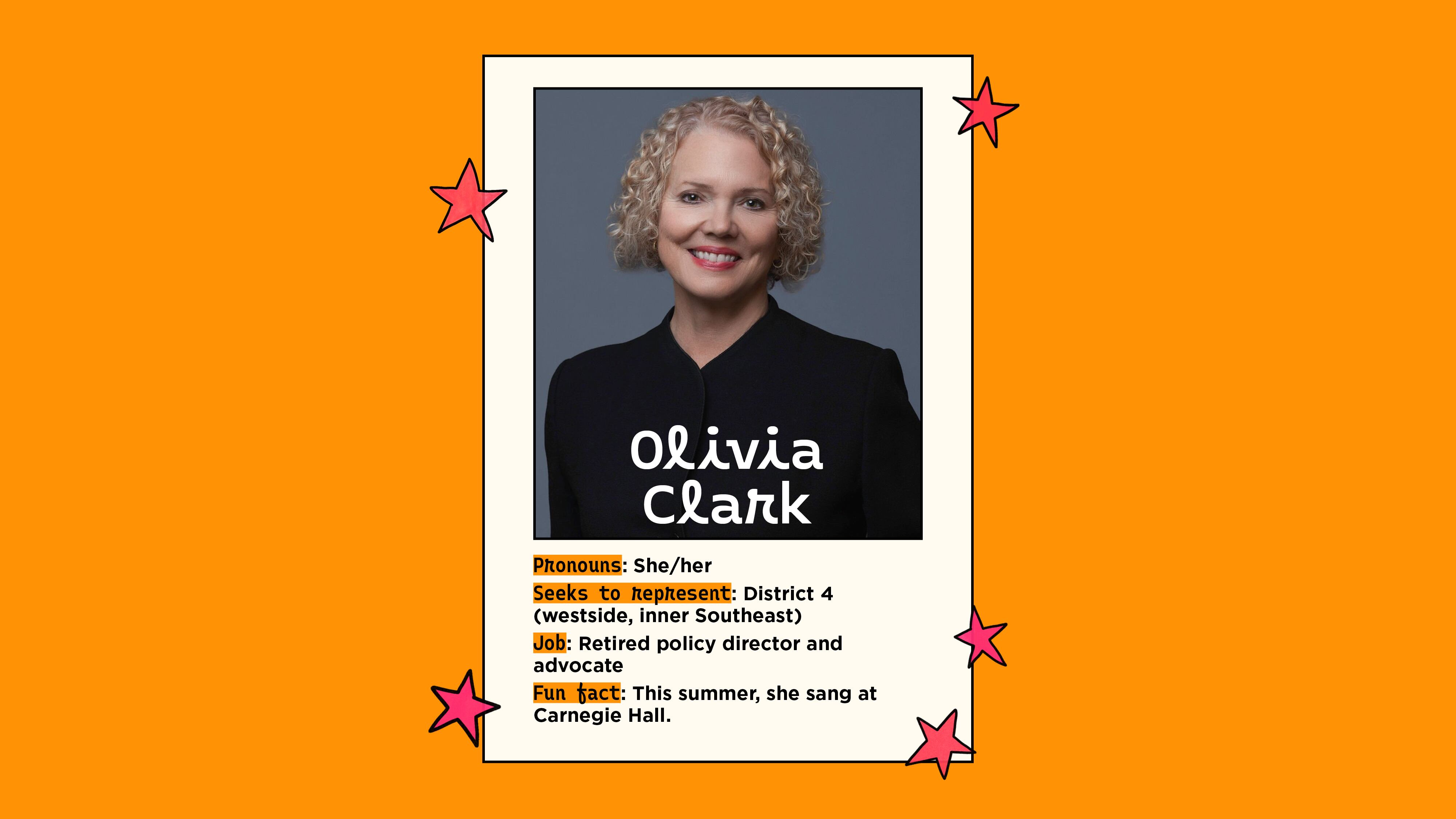 Olivia Clark grew up in her father’s diners in California, serving police officers coffee at 5 am and peeling mountains of potatoes after church on Sundays. Clark says she knows hard work, and she’ll use that work ethic—and her years of experience in government—to make the new form of city government work for Portlanders.