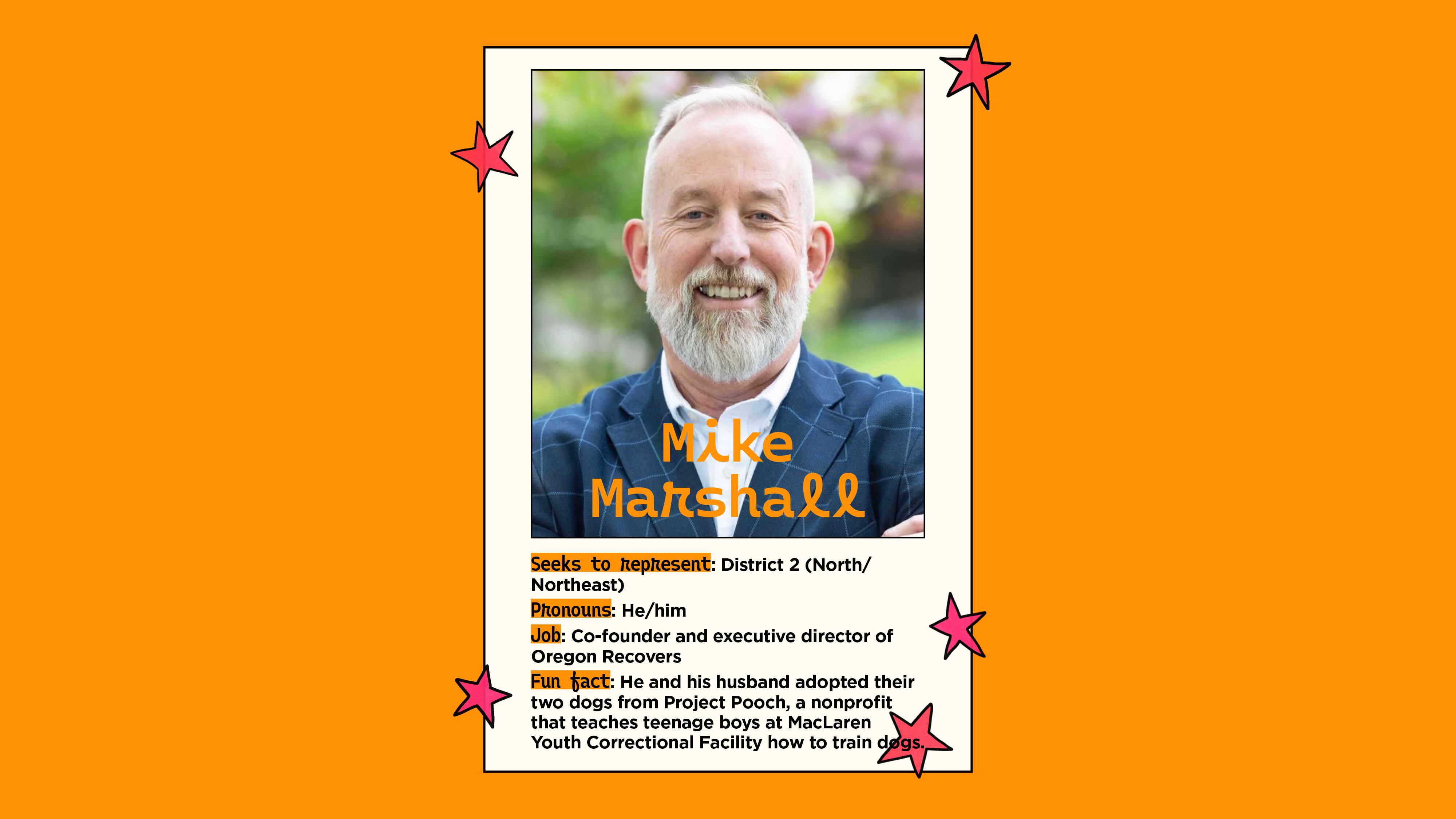 Mike Marshall: The first thing I’ll work on is to ensure our new system of government is set up to succeed. I want to focus on building a robust legislative oversight process and a fully integrated constituent services system so that the goal of really reconnecting people to their elected government occurs. Secondly, I want to use my lived experience and policy expertise as a person in long-term recovery, and who’s been working on that issue for seven years, to slash Portland’s untreated addiction rate. My third priority is making our streets both safer and feel safer by hiring and training more cops. We need to look at our recruitment policies and make sure we’re hiring cops that embrace Portland’s progressive values and, ideally, who live in Portland.