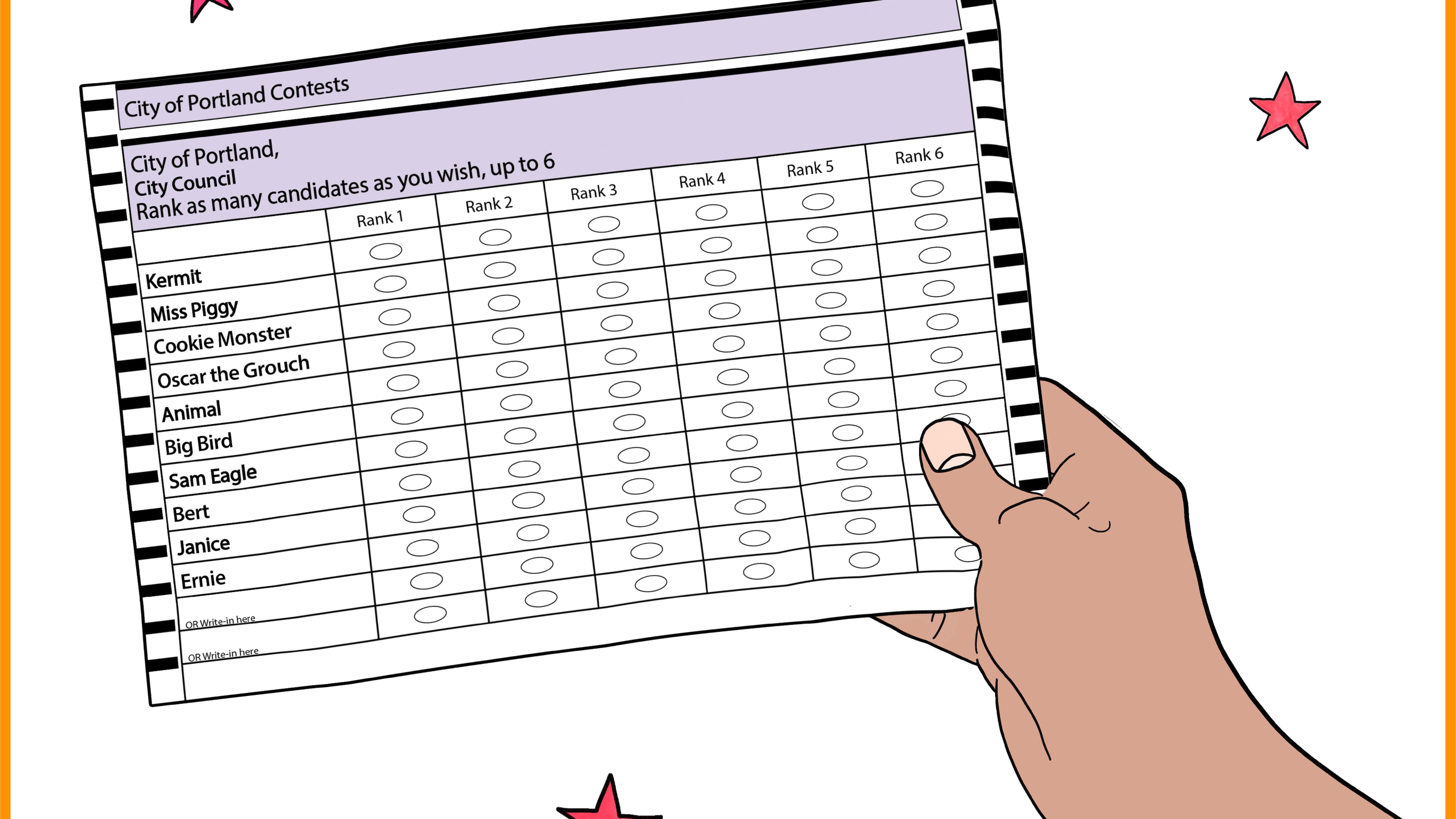 Take a look at the mock ballot below. Looks like a damn spreadsheet, right? You’ll see a list of candidates down the left side of a grid and preferences across the top (Rank 1, Rank 2, Rank 3…). We’ve used the Muppets as an example. If you love Miss Piggy and believe she is the best choice to represent you in elected office, you would fill in the bubble marked “Rank 1″ on the line by her name. If you really, really like (but don’t love) Fozzie Bear, you might fill in the “Rank 2″ bubble by his name. And so on. (Wocka! Wocka!)