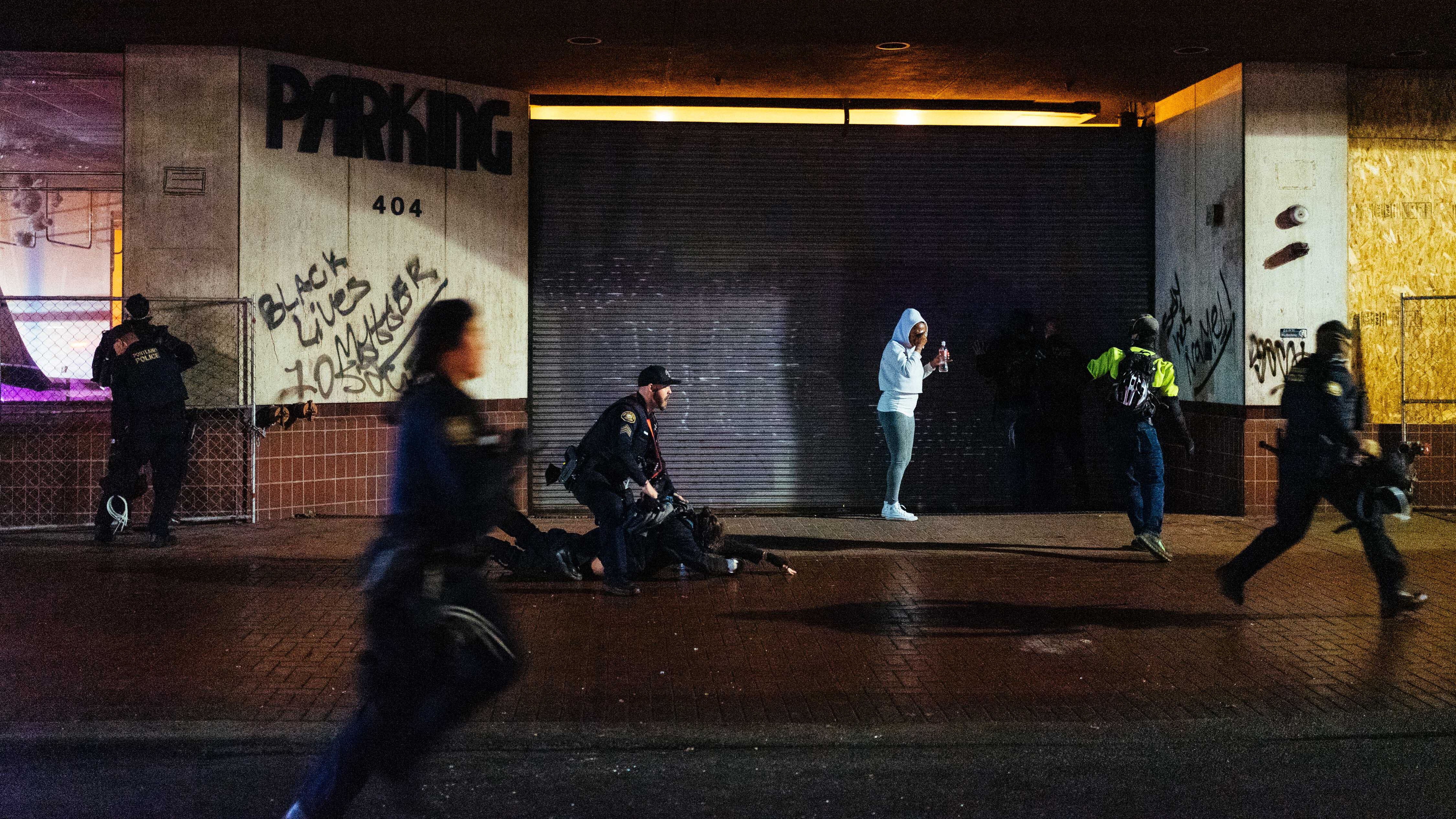 But police quickly followed, tailing any groups that formed and dispersing them with more smoke and flash-bangs in a cat-and-mouse game between officers and civilians. Some protesters carried speakers thumping with music, and others chanted familiar rallying cries like "Stay Together, Stay Tight!" and "Whose Streets? Our Streets!" as they evaded police.