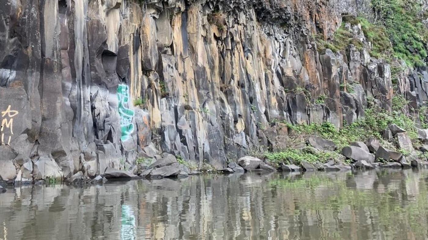 Residents living along the Columbia River Gorge spotted an unwelcome sight on April 23: The cliffs on the Washington side of the river, across from Rooster Rock, were tagged with graffiti.