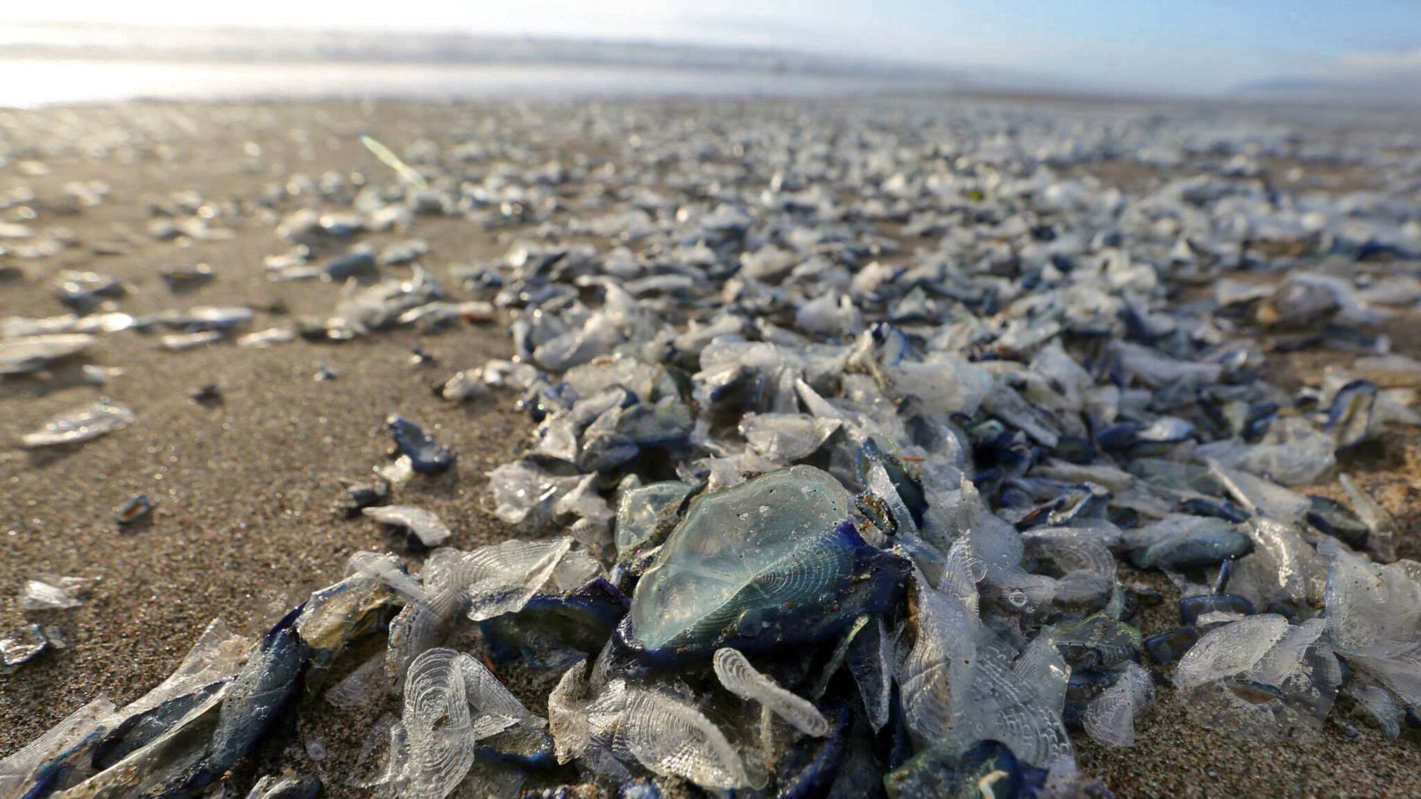They're called Vellela vellela, and they resemble something like a cross between a cut onion and a jellyfish. They're commonly known as "by-the-wind sailors," which refers to the triangular sail-looking pieces on the organisms.