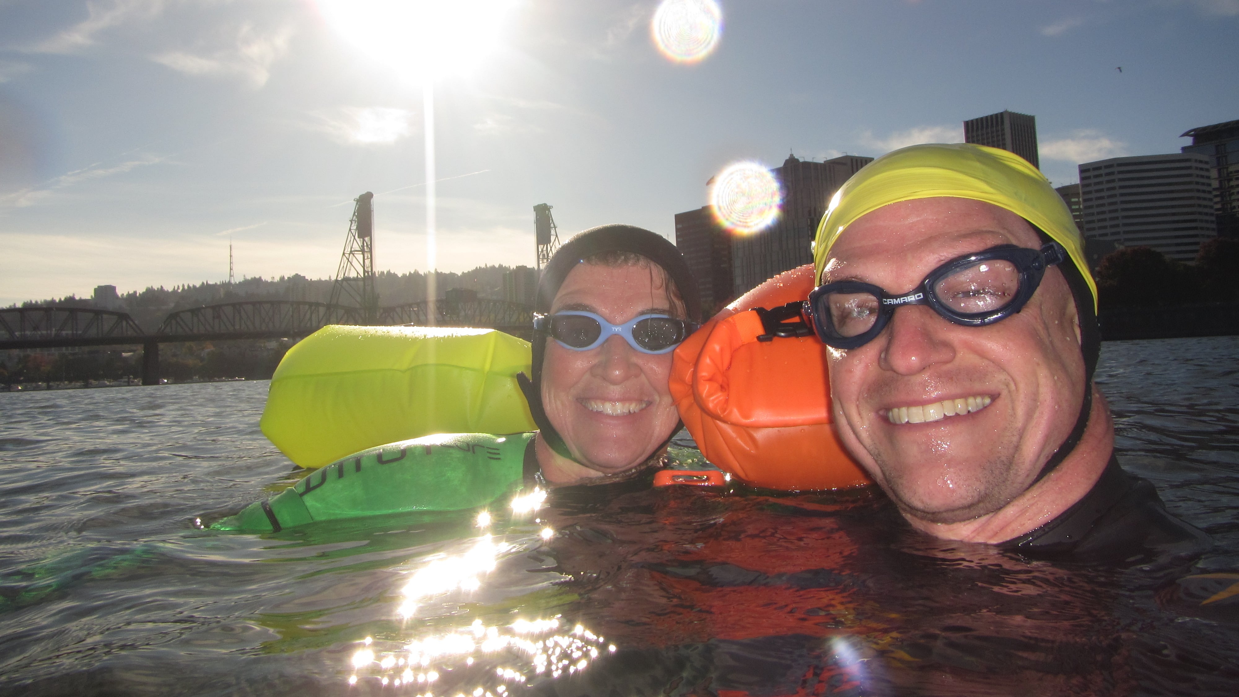 Clad in an ensemble of silicone, neoprene and plastic, Jill and I plod toward the Willamette River at Poet's Beach, underneath the Marquam Bridge, inflatable safety buoys tethered to our waists. It's a gray November morning. At the water's edge, we squeeze our hands into tight gloves, bump fists, then wade in.