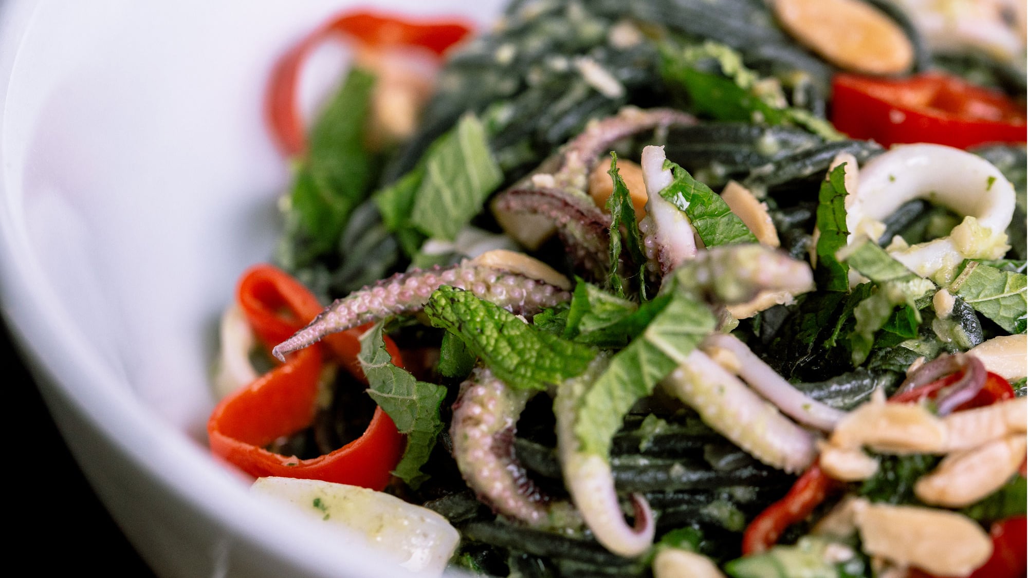 The concise dinner slate breaks into four main parts. The pasta section hews most closely to the classical. An amply portioned bowl of tagliatelle with pork shoulder, Calabrian chili and tomato bolognese ($17) reveals no surprises, but each component is perfect, from al dente strips of pasta to a just-kicky-enough sweet-hot chili jolt. On the more adventurous end of the spectrum, squid ink spaghetti ($18) arrives with plentiful points of interest: unadorned squid rings and tentacles, crunchy bits of almond and punchy jalapeño pesto, plus a flurry of chopped mint leaves, delicate white onion blossoms and preserved Fresno chilies for still more flavor and visual flair.