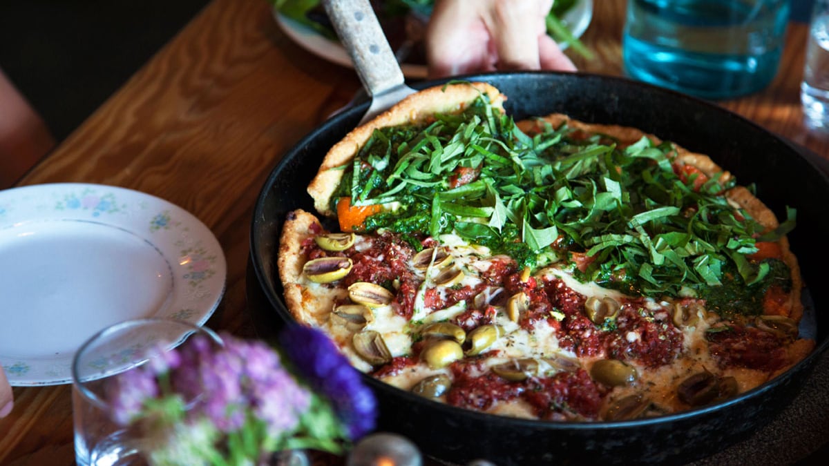 Dove Vivi's signature cornmeal crust traveled up the coast from L.A., but if someone told you this is how they do pizza in Appalachia, it'd be easy to believe, particularly given the dining room's twee-rustic décor. The pies ($25.75 whole) arrive in a skillet—each variation has its own buttery essence. And those distinct crusts pair especially well with the veggie options, which include sweet corn, roasted eggplant and marinated bell peppers.