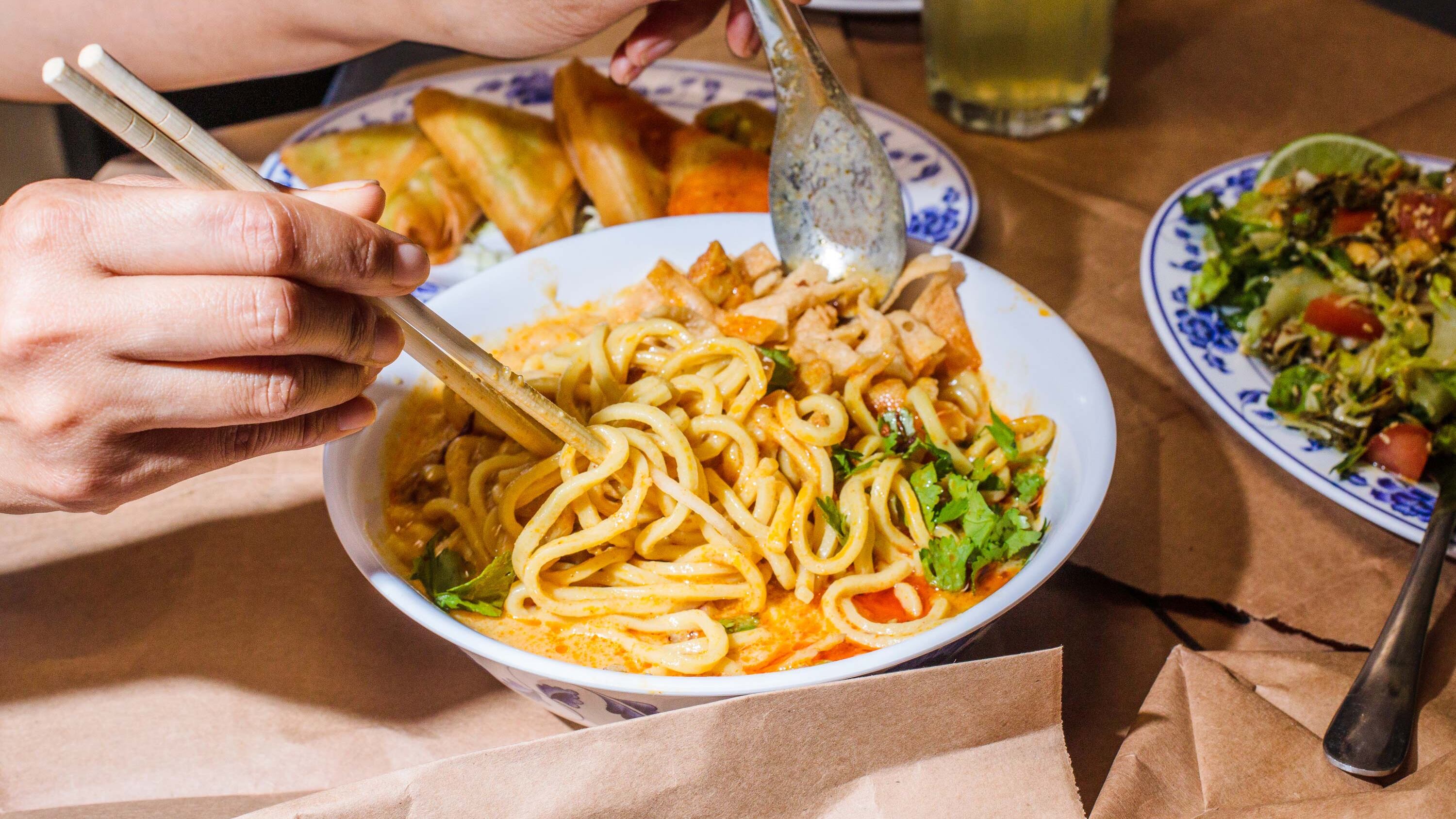 A selection of rich curries round out the second half of the menu. More traditional options that are simply rice and a curry-doused protein can be found here, but the real star is the paratha ($8.50), which features a soft flatbread roasted in avocado oil and covered in curried chicken or pork. It's one of the few items on the menu you might tackle in your car, and the fact that Top Burmese offers curbside delivery service means you can smash one of these on the way home from work in lieu of a Crunchwrap Supreme.
