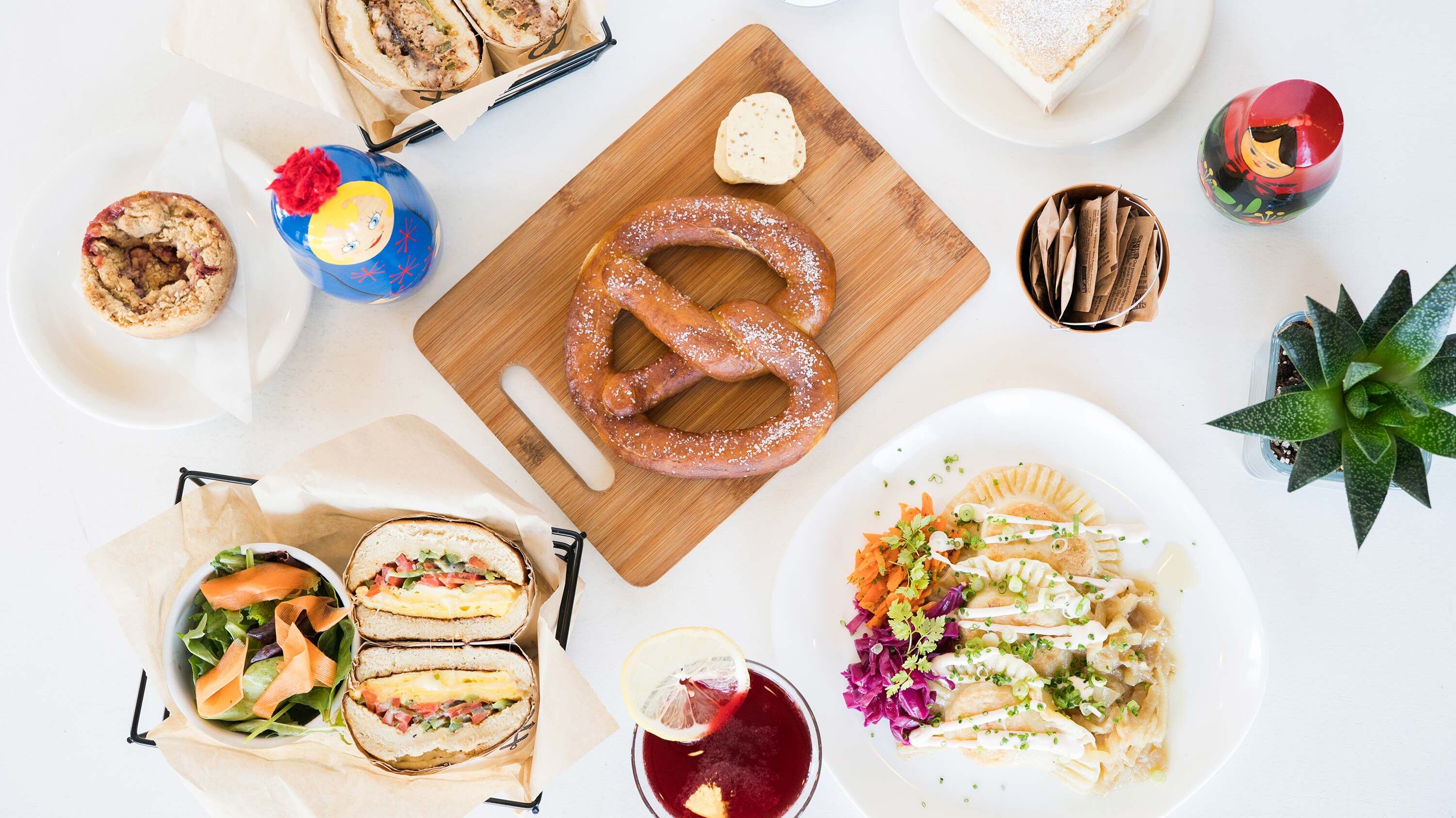 The pretzels remain the star of the show in the cheery, understated space, which employs minimal décor aside from a few modest Etsy-chic appointments and a mural that depicts cute and colorful humanoids riding oversized birds in space. It was nearly empty on both our visits, one of which was during prime brunch time on a Saturday afternoon. Pretzels and pierogis might not scan as the practical protein-based morning-after solution most diners are used to, but what's inside and on top of them proves to be a magical improvement over a simple product that's already damn-near perfect.