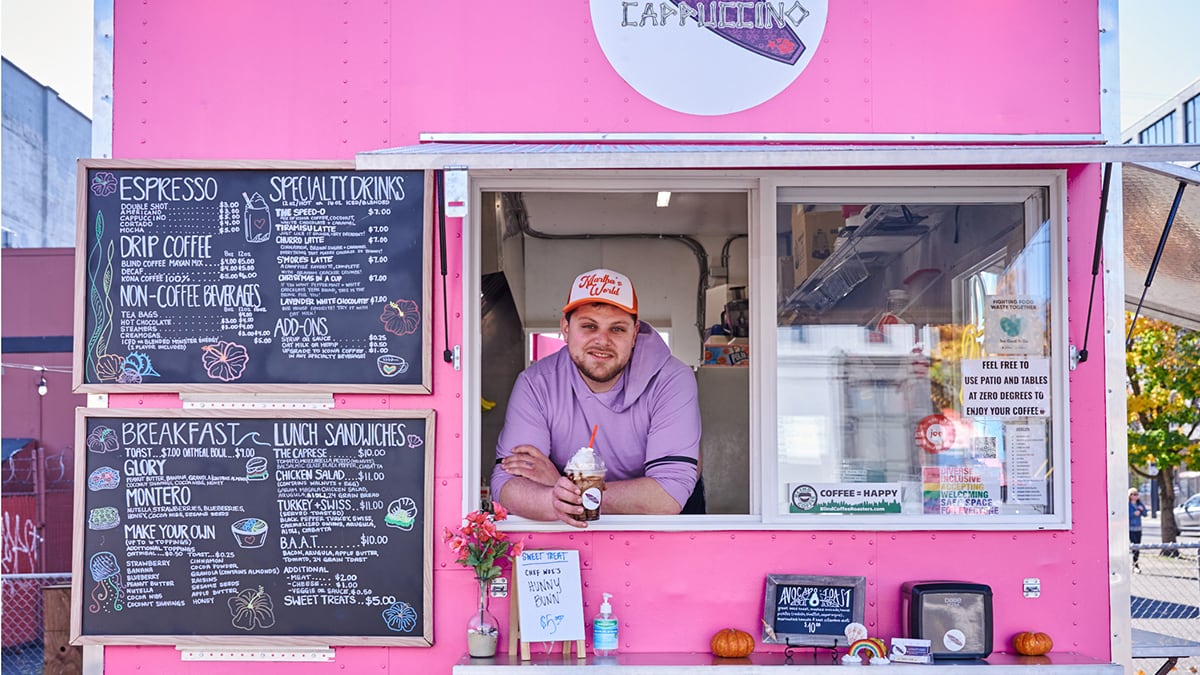Speed-o Cappuccino’s bubblegum-pink coffee cart stands out against the otherwise drab strip of Southeast Martin Luther King Jr. Boulevard and Oak Street. Its Progress Pride flag—a version of the Pride flag that Oregon graphic designer Daniel Quasar created to include the trans community—waves as a friendly hello or sashay away.