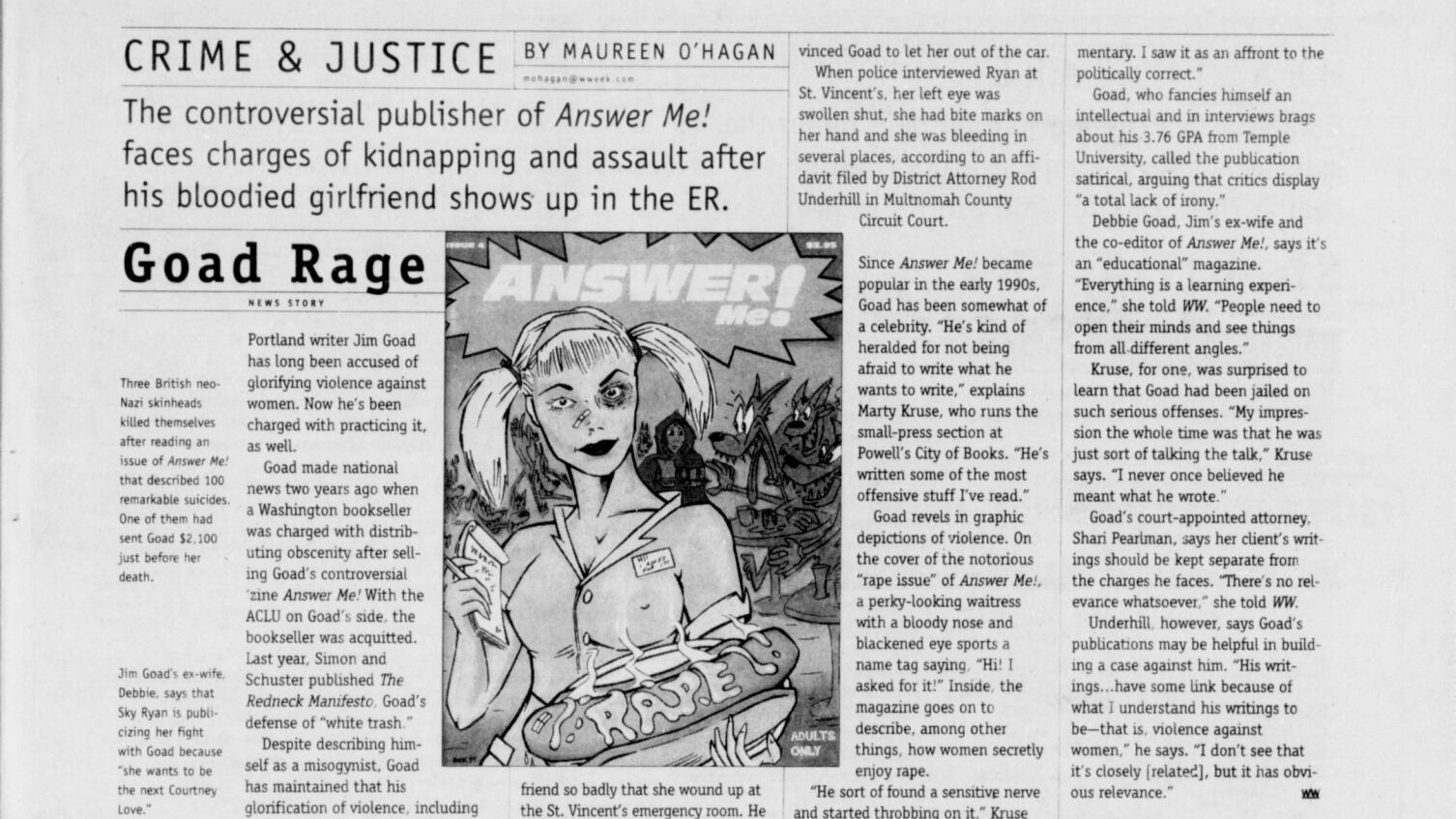 In issue No. 4 of Answer Me! Goad writes, "I am not a member of a global male conspiracy to subjugate women by force." On May 31, however, police charged Goad with exactly that, arresting the 37-year-old writer for beating his girlfriend so badly that she wound up at the St. Vincent's emergency room. He has been charged with kidnapping and six counts of assault—the former charge a Measure 11 offense that will earn him 7 1/2 years in prison if he's convicted.