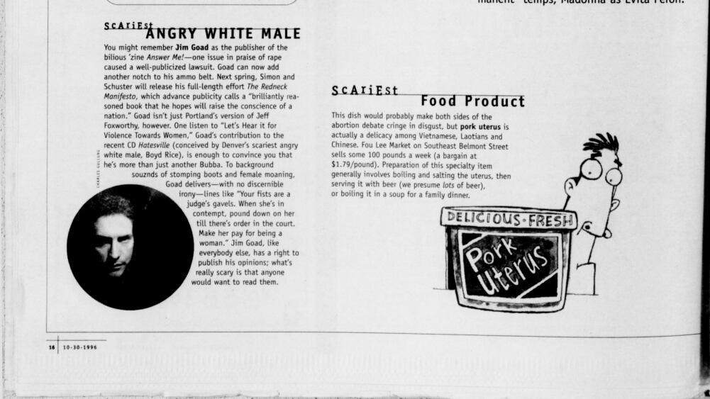 Jim Goad, like everybody else, has a right to publish his opinions; what's really scary is that anyone would want to read them.