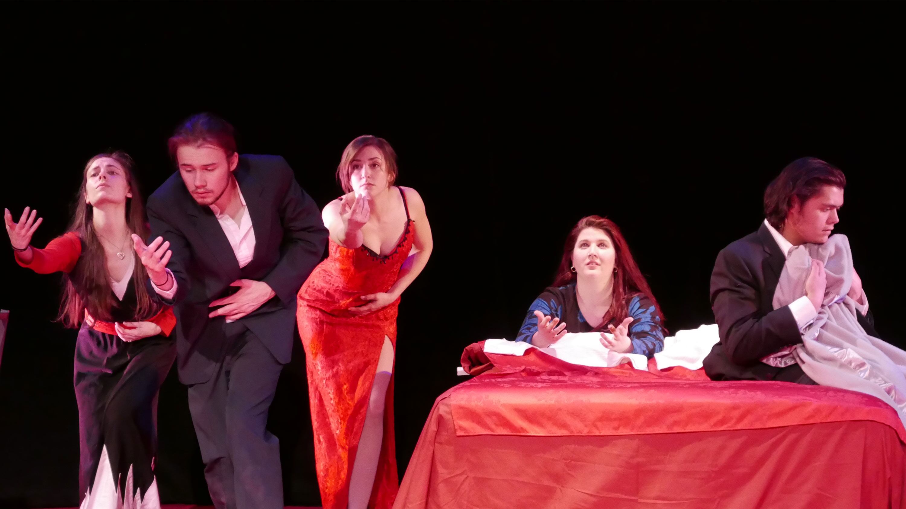 Seven actors dramatically pose at the front of the stage and then begin to wordlessly hustle around the set. Eventually, ensemble actor Haden Cadiz breaks free from that animatronic state and recites a love poem to actor Anashkusha Beauchamp, who remains partially in the dream world—she stares blankly into the audience, and doesn't make eye contact with Cadiz.