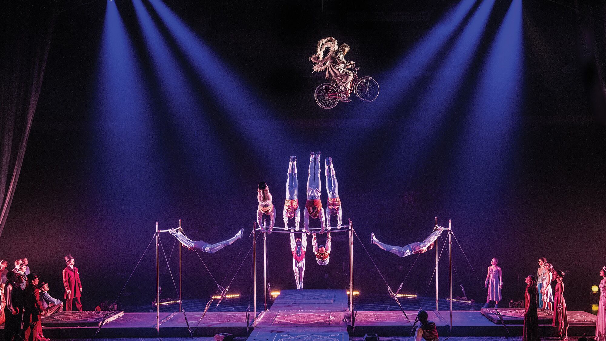 The show is about Mauro, a clown, and his funeral procession. It's about him revisiting his whole life—all of his gypsy circus friends, his loves, his memories of childhood. Tournik is the finale. The act is basically a celebration for Mauro and it's his farewell. It features 10 guys and six bars. There are four bars in a cube with two bars laterally on the outside parallel to the cube. We have everything from a solo, where there's one guy on a bar to 10 guys spread out between all six bars. It's not work, really. It's just having fun.