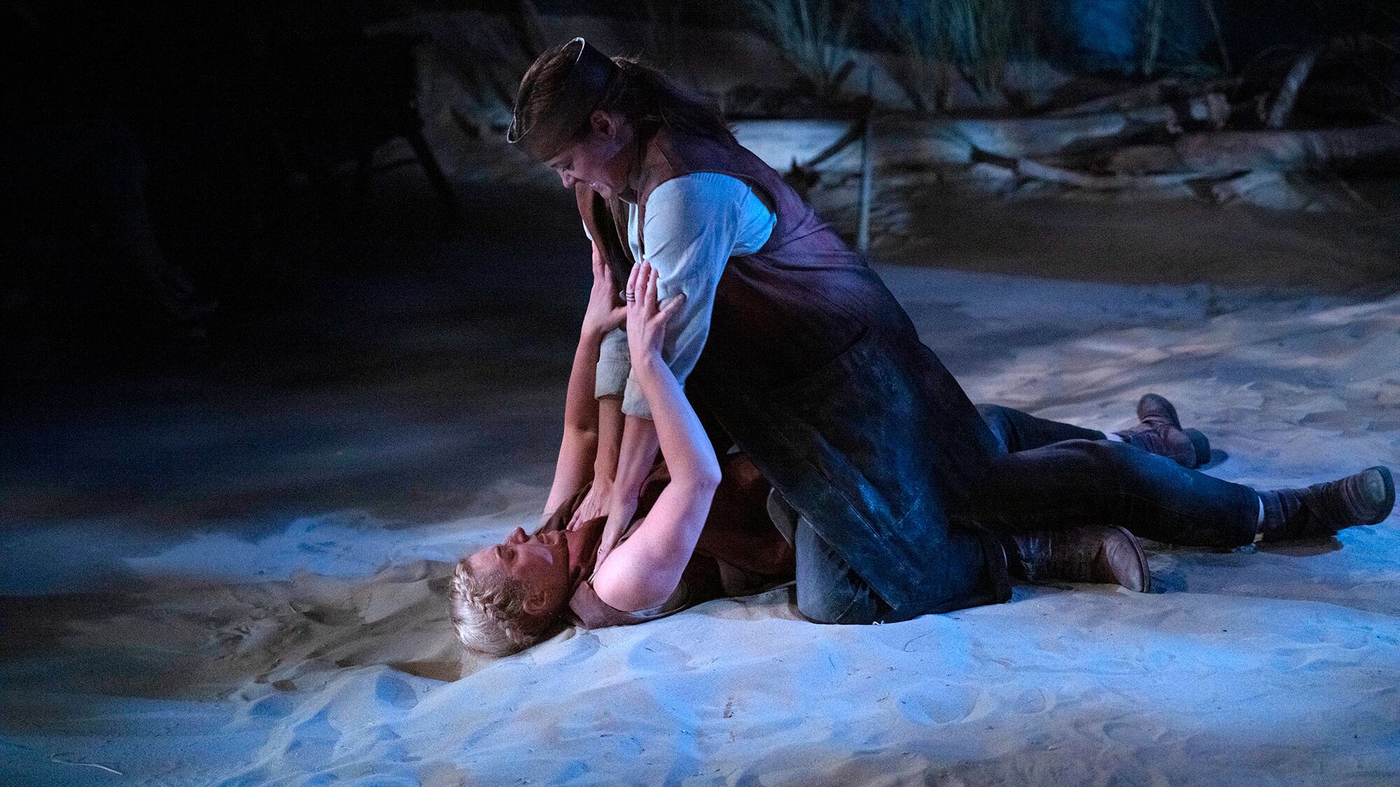 A similar problem bedevils the set, a sandy mound adorned with a square archway and some pieces of wood. The idea of Macbeth on a beach is irresistible—it's chilling to watch people kill and die for a small, barren swath of seaside land, and the sight of Lady Macbeth scrubbing her hands with sand in the "Out, damned spot!" scene is brilliantly unsettling. Yet the set's openness is at odds with the claustrophobia the narrative demands. Macbeth terrifies because it speaks to the most paranoid part of our minds—the part that believes assassins and conspiracies lurk at the end of every shadowy corridor.