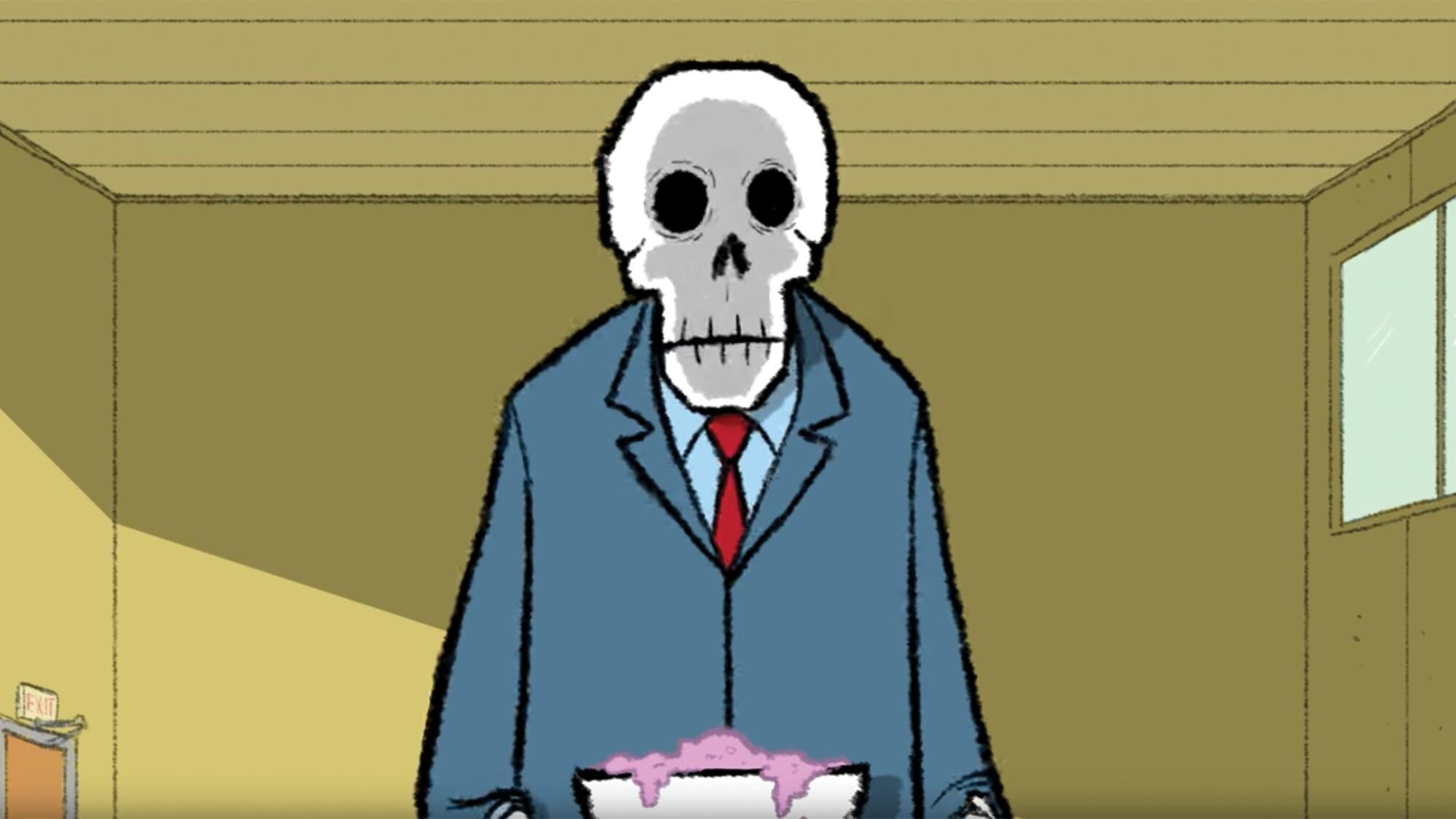 But look at it another way, and the animator's feasts of tension are derived from genuine vulnerability. Grickle: A Cartoon World opens with the recurring character Principal Skeleton (who looks exactly what he sounds like) soberly delivering a school announcement. He flips on the PA system and opens his exposed mandible to let out a long, aching groan—some kind of unintelligible testament to a world with no reaction. This pattern repeats throughout the hour of Grickle: Stranger approaches stranger; one shares a song, dance or secret, and waits silently for an unpredictable response.