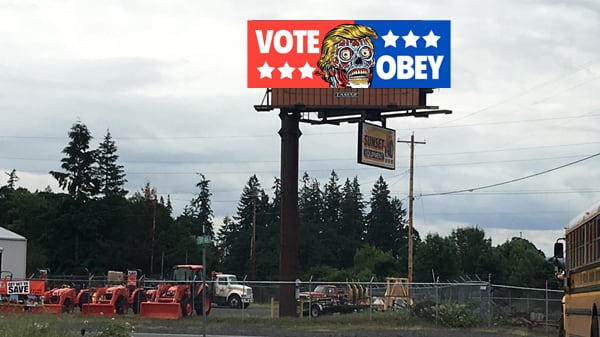 The image, which will go up next month, depicts President Donald Trump as one of the skull-faced aliens from the 1988 sci-fi classic—which stars the late Portland wrestling legend "Rowdy" Roddy Piper— along with the words "Vote, Obey."