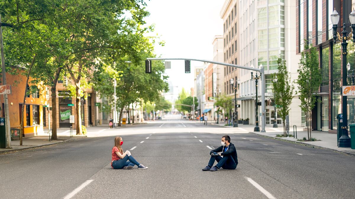 Love in Dangerous Times opposes escapism in a couple senses, electing instead to explore the eeriness of single lockdown life. Physically, that manifests in some irreplaceable scenes of a deserted downtown Portland circa April. At one point, Jason even lies down smack in the middle of Southwest 3rd Avenue and Salmon Street.