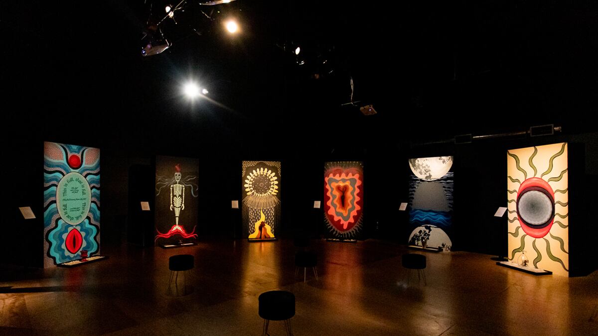 Van Der Merwe decided to structure Refuge around 11 goddesses who could both comfort and provoke. She painted panels with brash acrylic shades to represent each goddess, then recruited writers and performers to incarnate the characters with either their voices or their bodies.